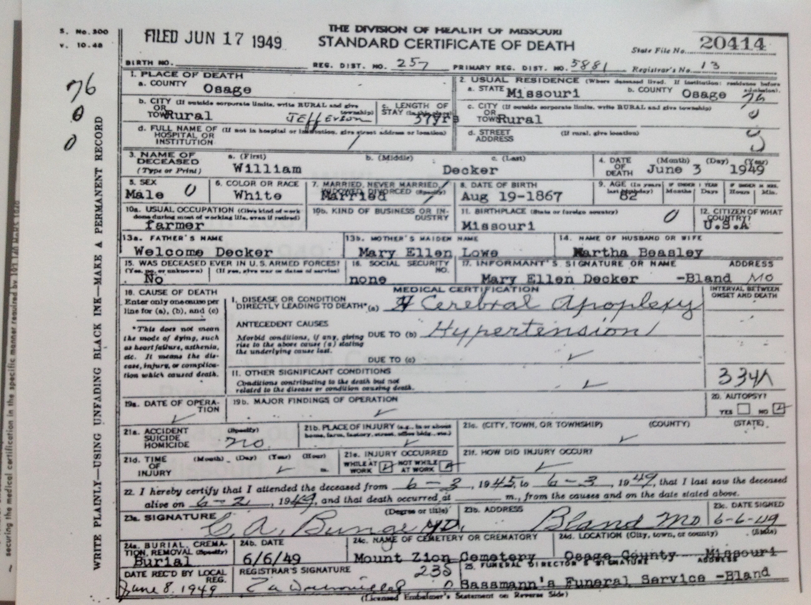 1949 Death Record