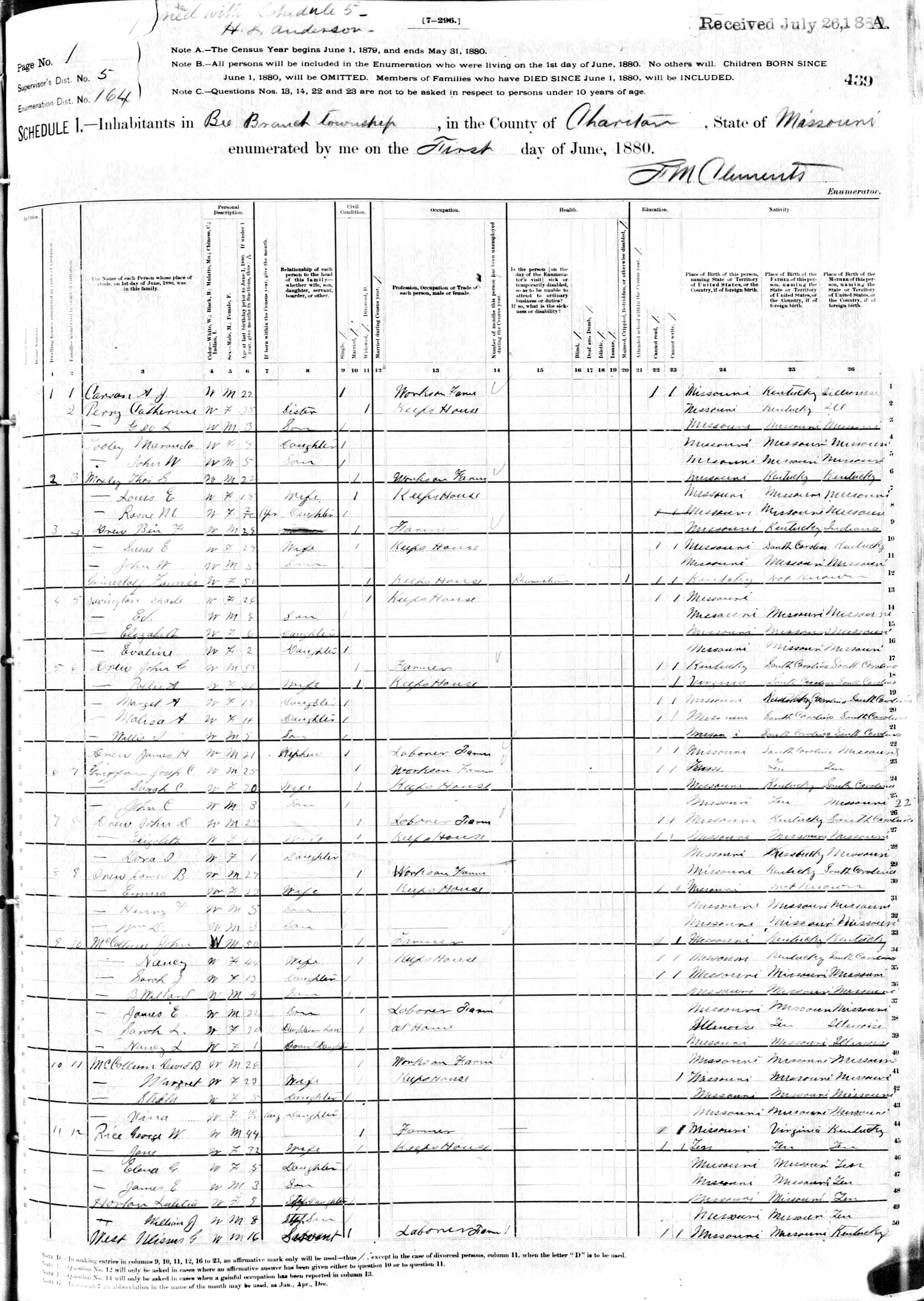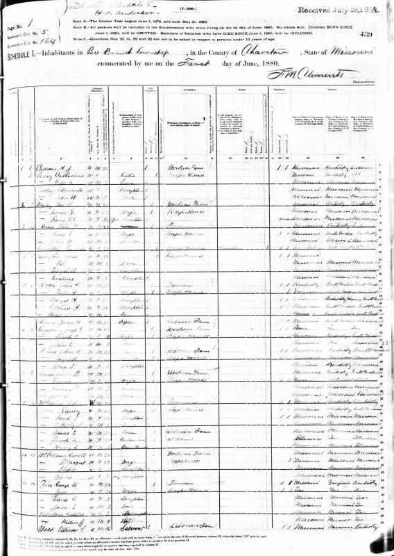 Drew Family 1880 Federal Census Missouri, Lines 26-28
