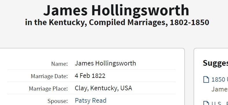 James Hollingsworth were married on February 4, 1822 in Clay, Kentucky, USA. She died.