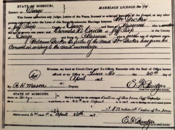 Corneila Alice Crider were married on April 22, 1888 in Osage, Camden, Missouri, USA. He died on June 3, 1949, at age 81, in Jefferson, Osage, Missouri, USA. He was buried in White Church Cemetery, Byron, MIssouri.