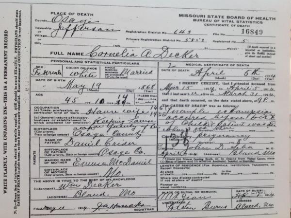 Corneila Alice Crider was born on May 19, 1868 in Osage, Camden, Missouri, USA. She and