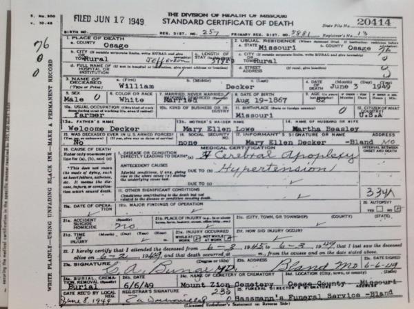 William Decker was born on August 19, 1867 in Missouri, USA. He and