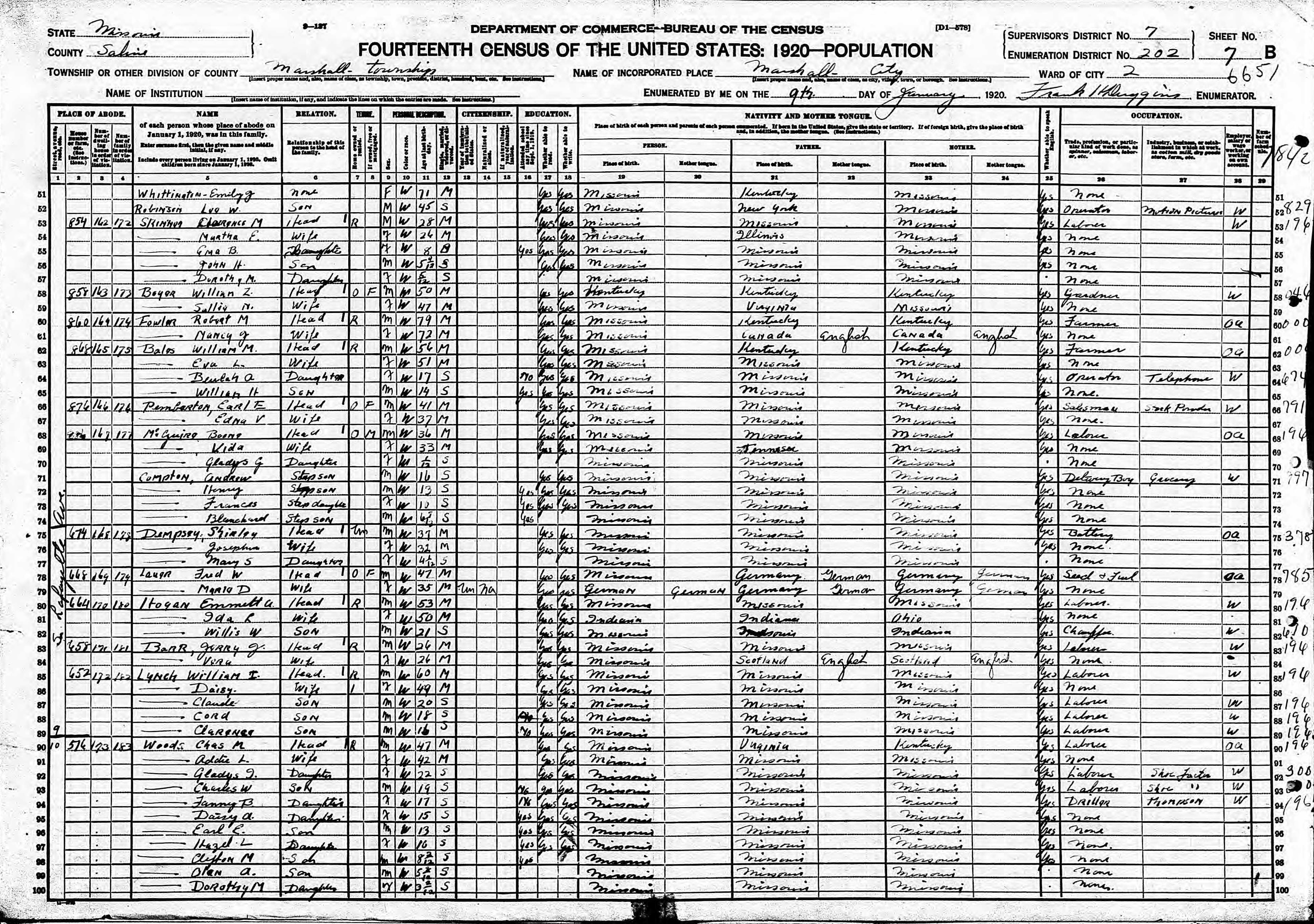 McGuire Family 1920 Federal Census Missouri, Lines 68-74