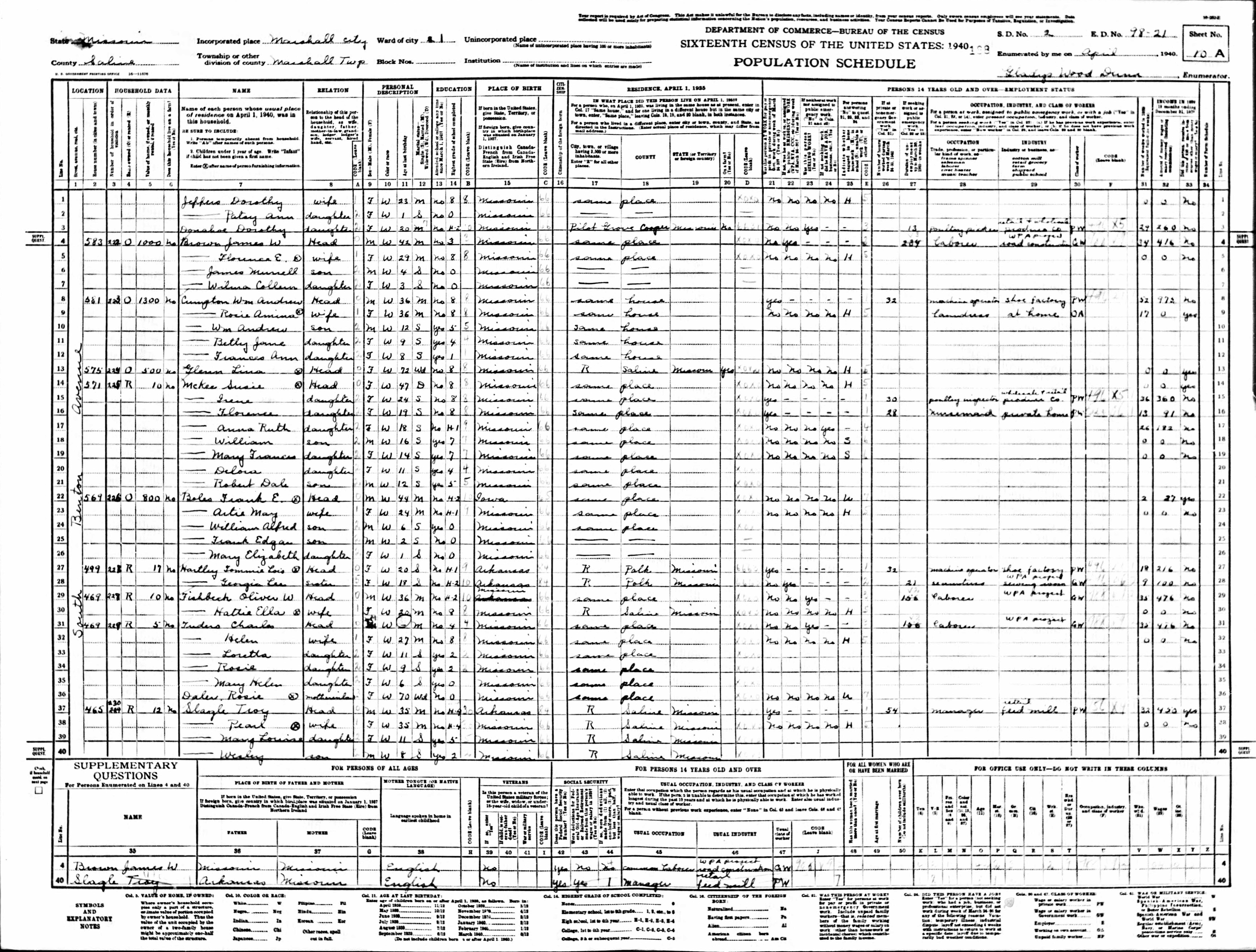 Cumpton Family 1940 Federal Census Missouri, Lines 8-12