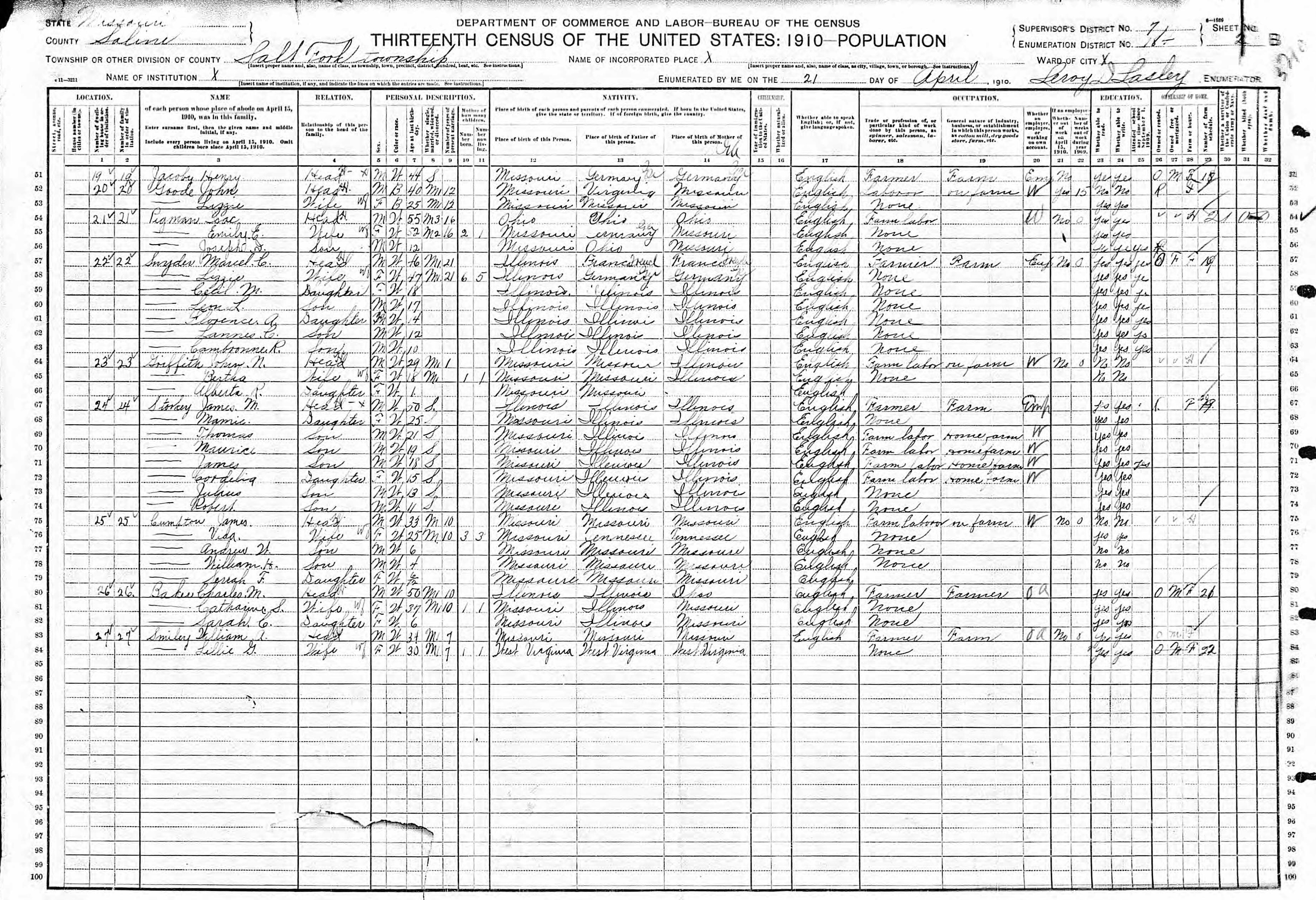 Cumpton Family 1910 Federal Census Missouri, Lines 75-79