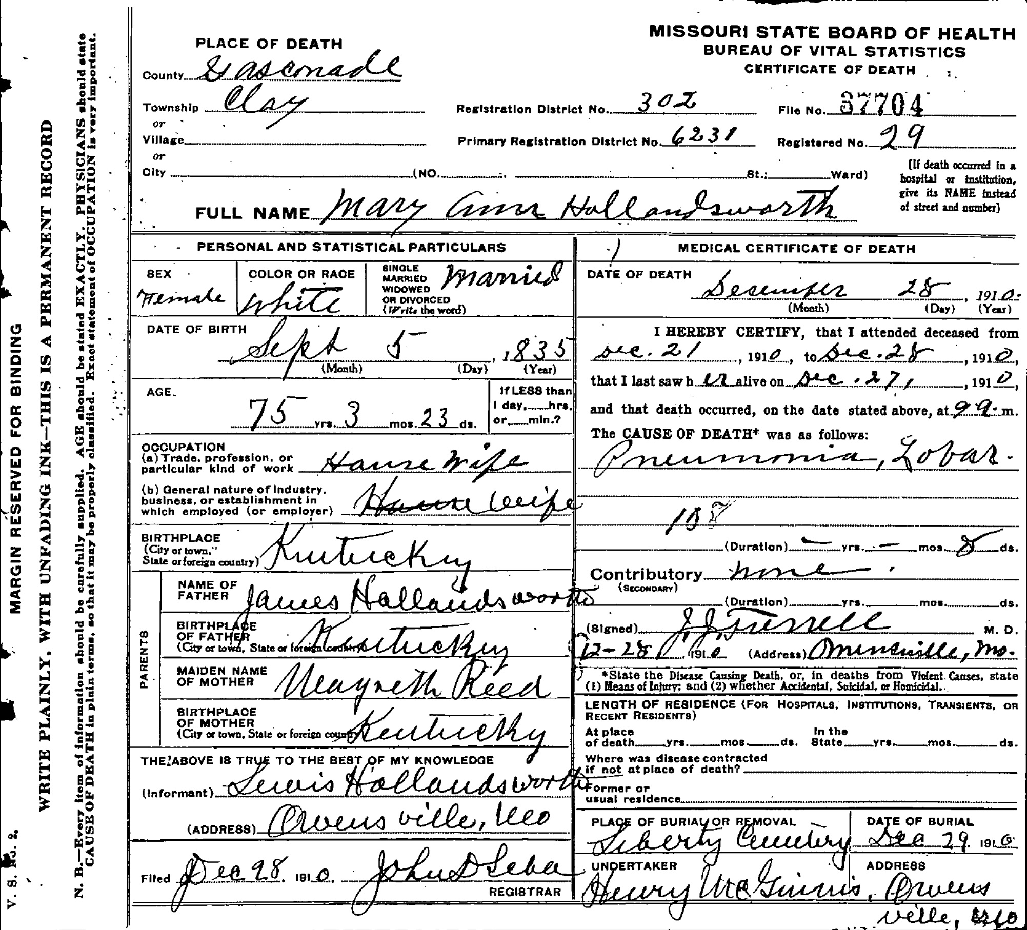Mary Ann Polly Hollandsworth was born on September 5, 1835 in Indiana, USA. She died on September 28, 1910, at age 75, in Clay, Gasconade, Missouri, USA. She was buried in Liberty Baptist Cemetery, Owensville, Missouri.