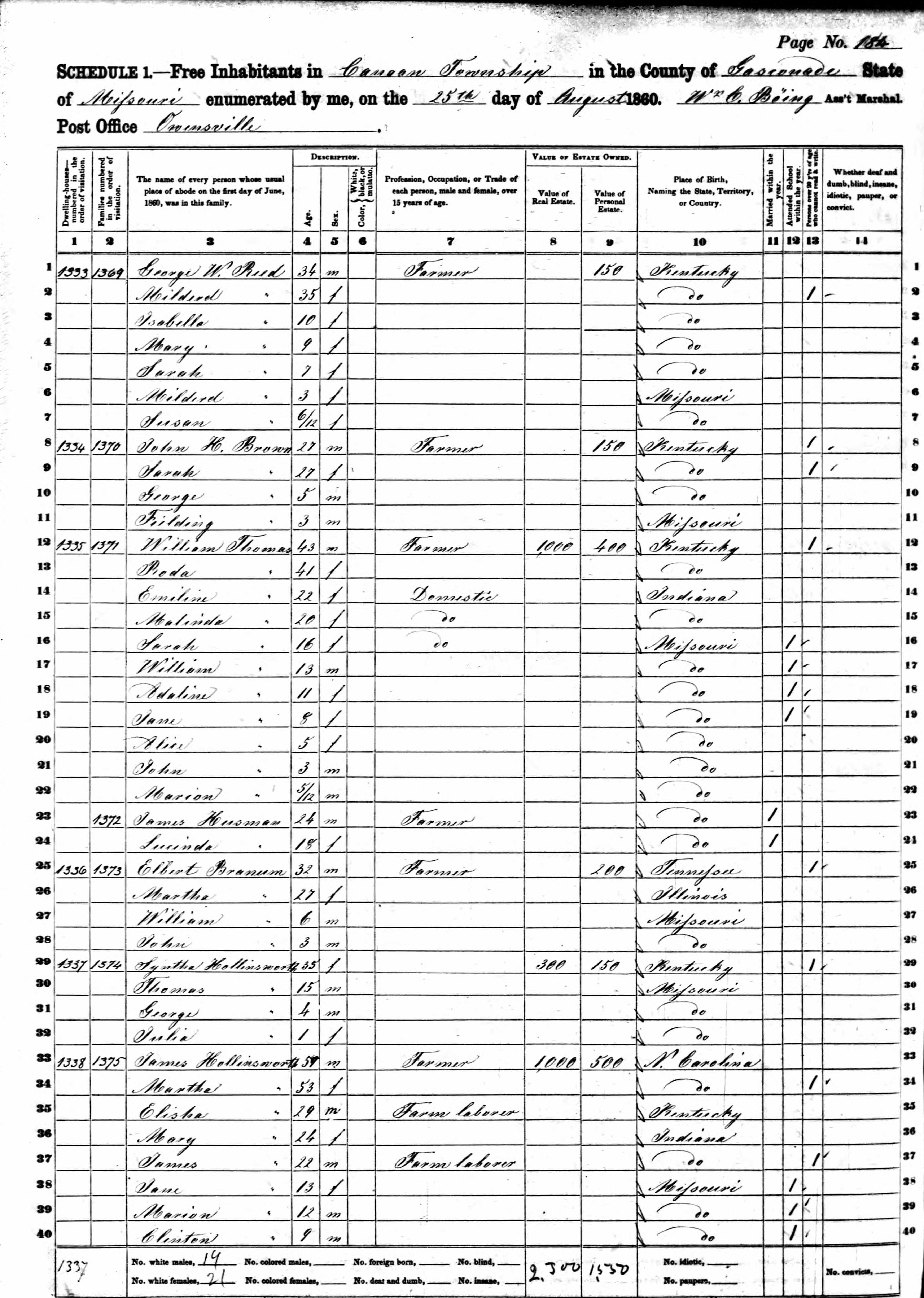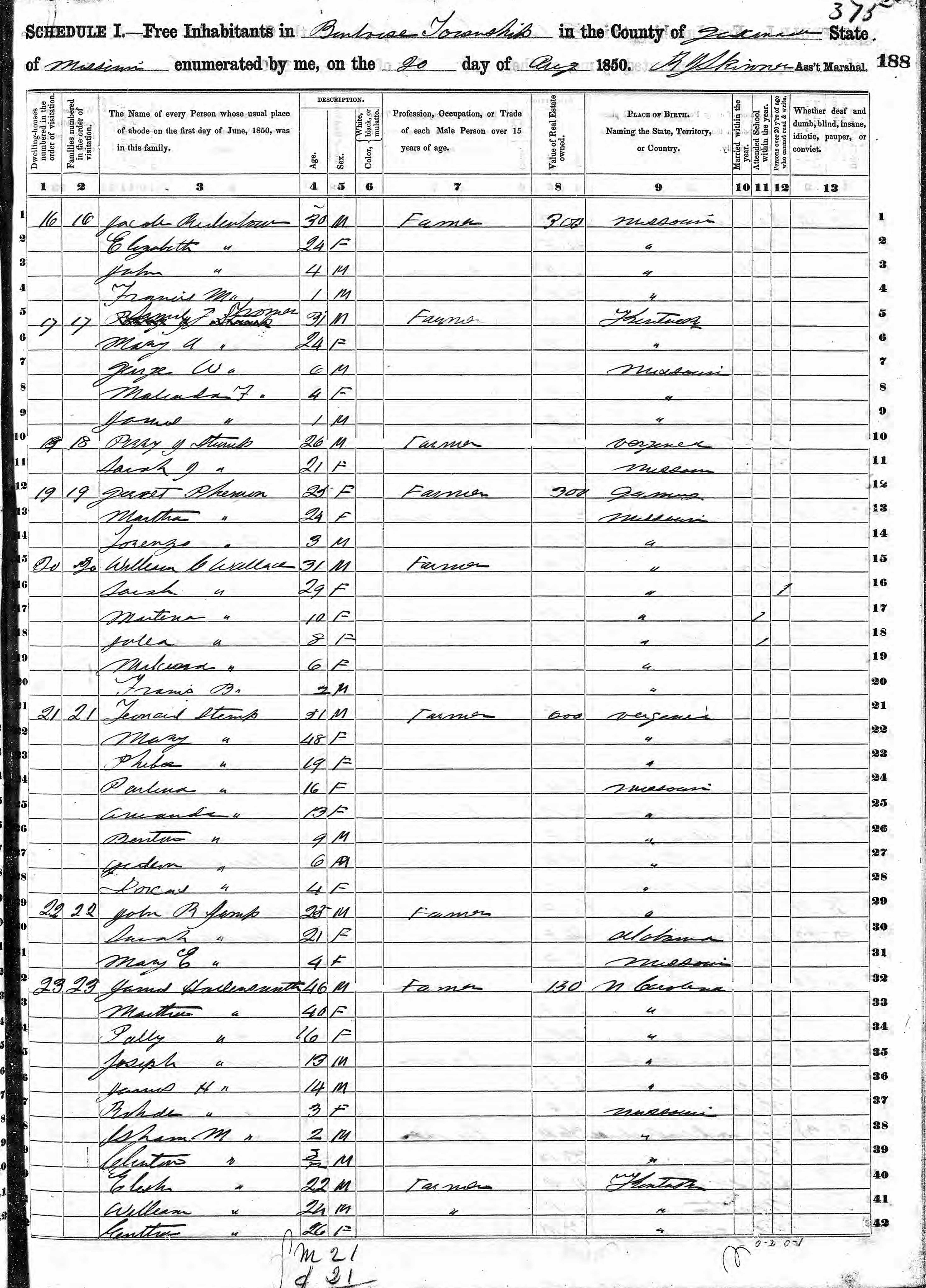 Hollingsworth Family 1850 Federal Census Missouri, Lines 32-42