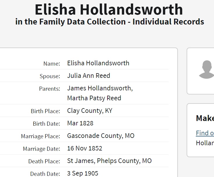 Elisha G. Hollandsworth were married on November 16, 1852 in Gasconade, Missouri, USA. She died.
