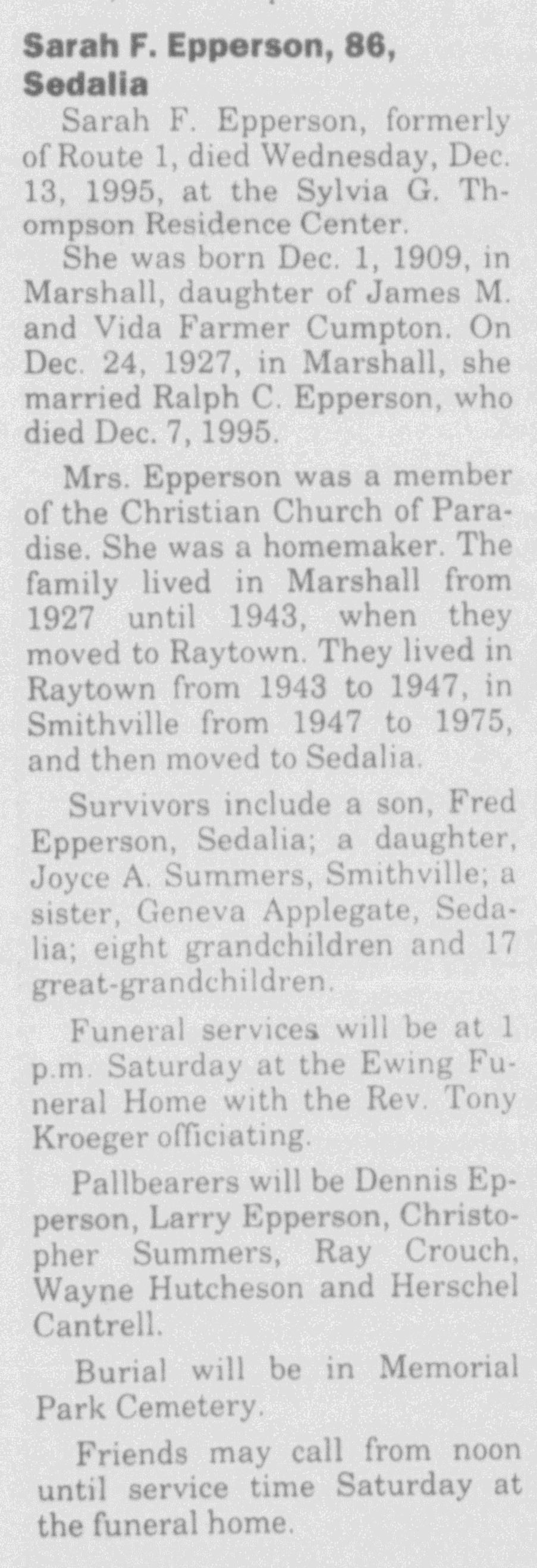 Ralph Charles Epperson, Sr., were married on December 24, 1927 in Marshall, Saline, Missouri, USA. She died on December 13, 1995, at age 86, in Sedalia, Pettis, Missouri, USA. She was buried in Memorial Park Cemetery, Sedalia, Missouri.
