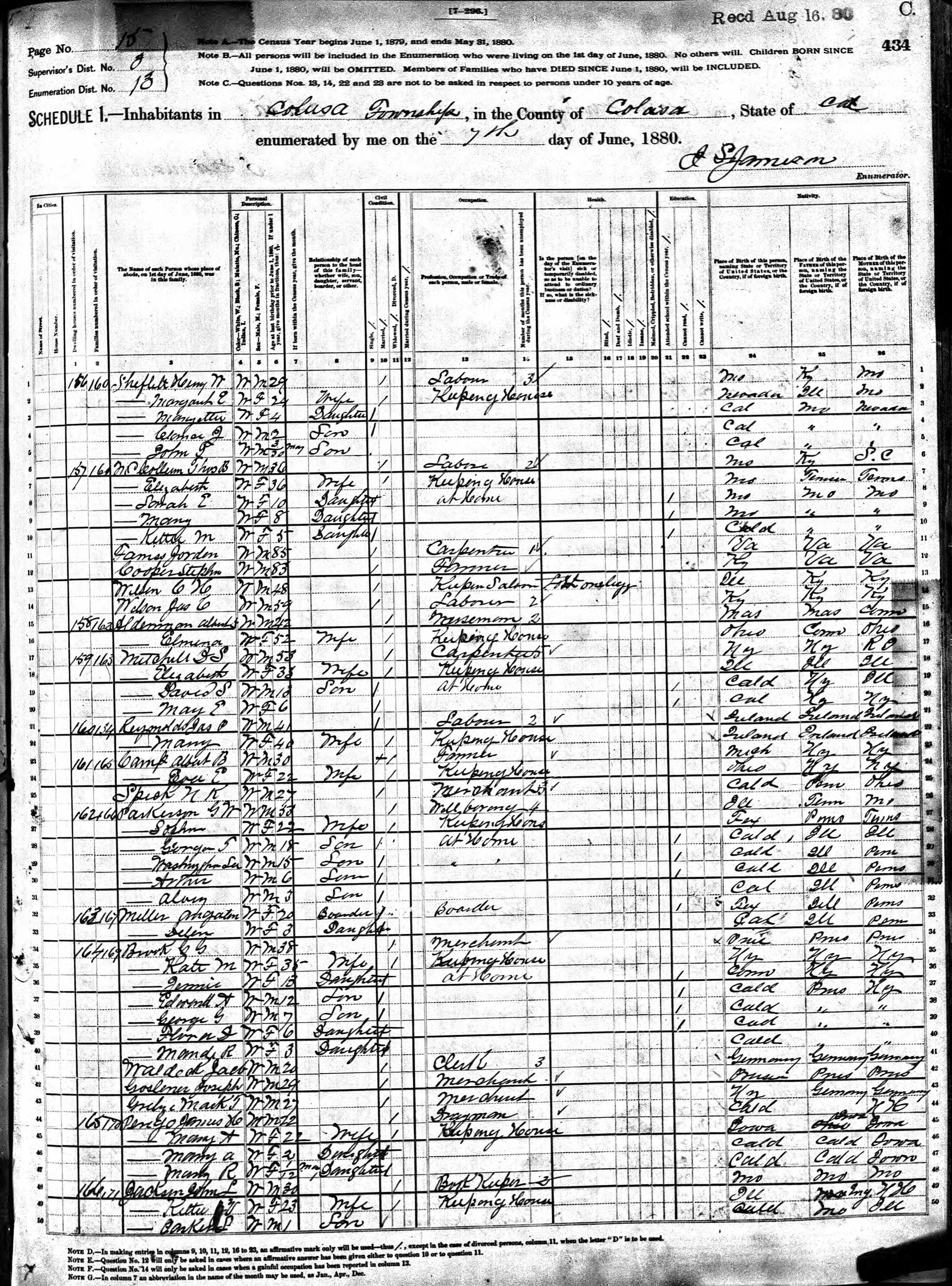 Shifflett Family 1880 Federal Census California, Lines 1-5