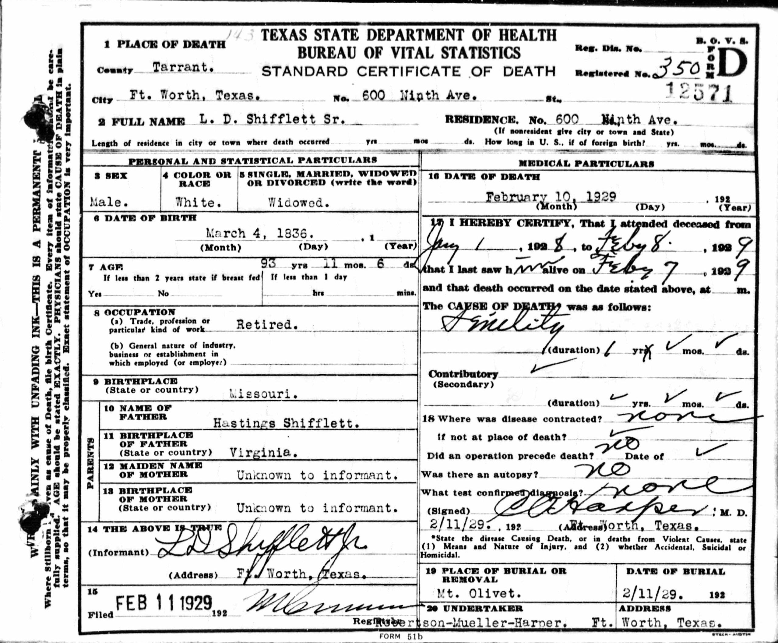 Harriett were married. He died on February 10, 1929, at age 92, in Forth Worth, Tarrant, Texas, USA. He was buried in Mount Olivet Cemetery, Forth Worth, Texas.