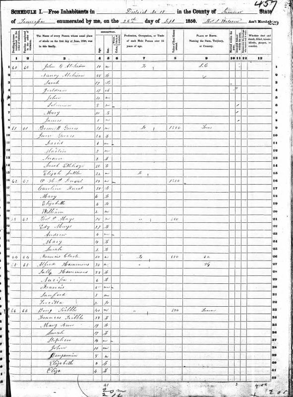 Atchison Family 1850 Federal Census Tennessee, Lines 1-8