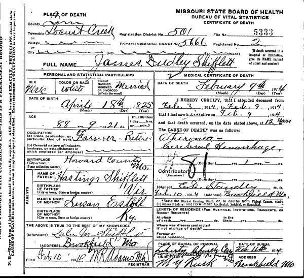 James Dudley Shifflett was born on April 18, 1825 in Howard, Missouri, USA. He died on February 8, 1914, at age 88, in Locust Creek, Linn, Missouri, USA. He was buried in Liberty Memorial Cemetery, Brookfield, Missouri.