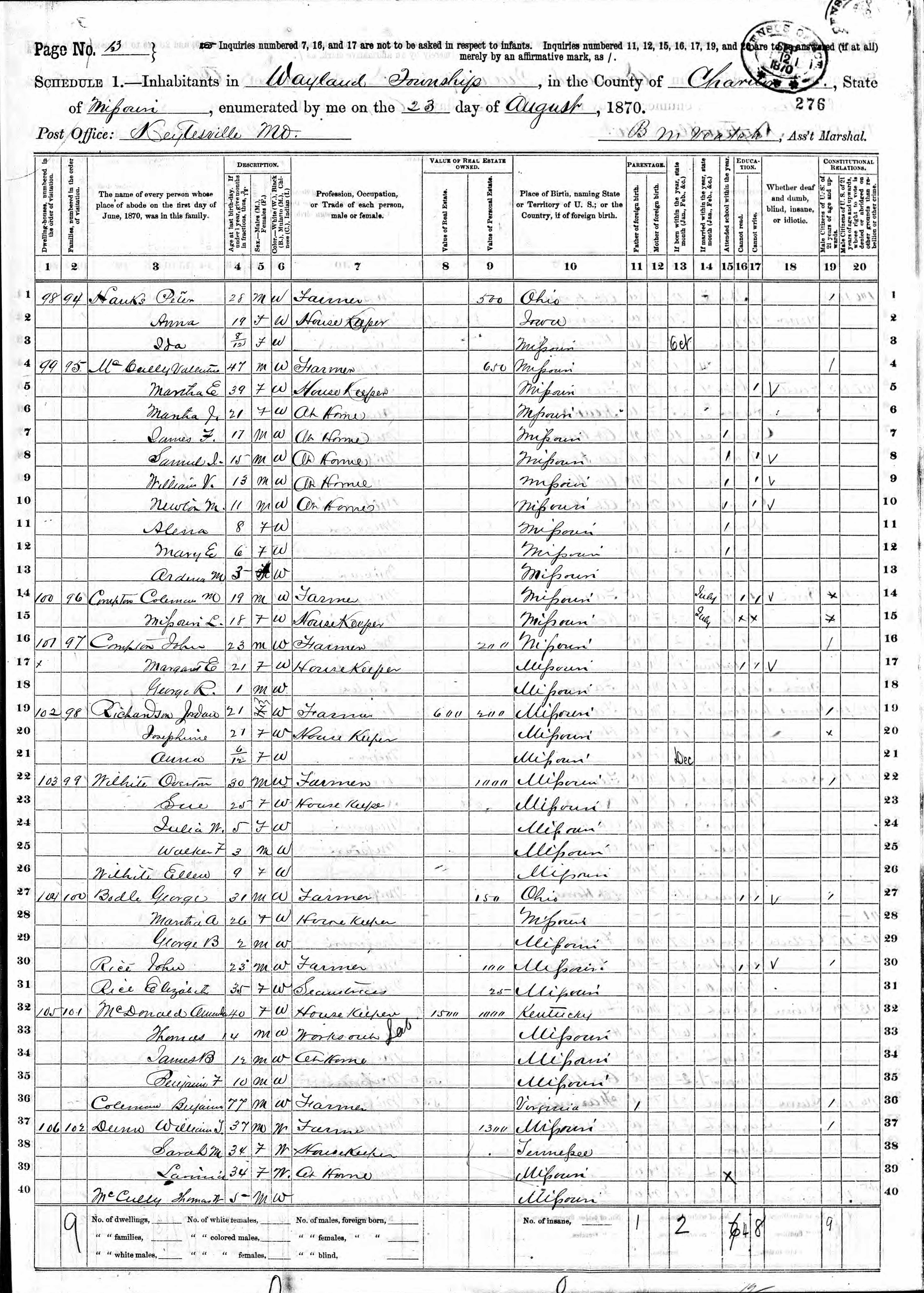 Cumpton Family 1870 Federal Census Missouri, Lines 14-18