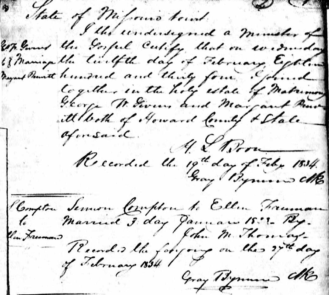 Lemuel Willis Cumpton were married on January 3, 1834 in Howard, Missouri, USA. She died.