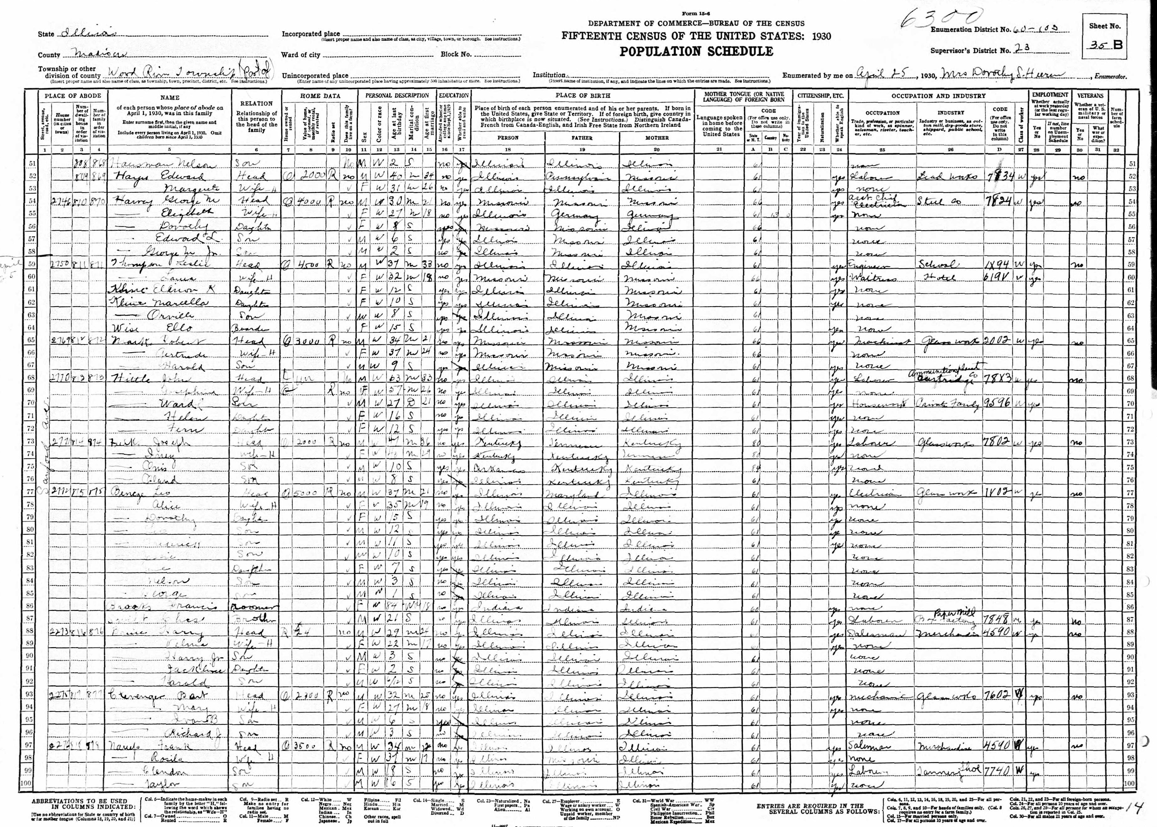Nelson Hausman 1930 Federal Census Illinois, Line 51