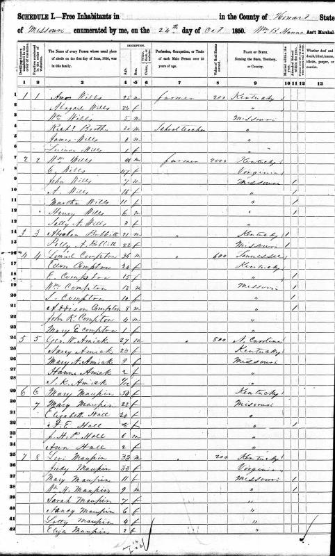 Cumpton Family 1850 Federal Census Missouri, Lines 16-23