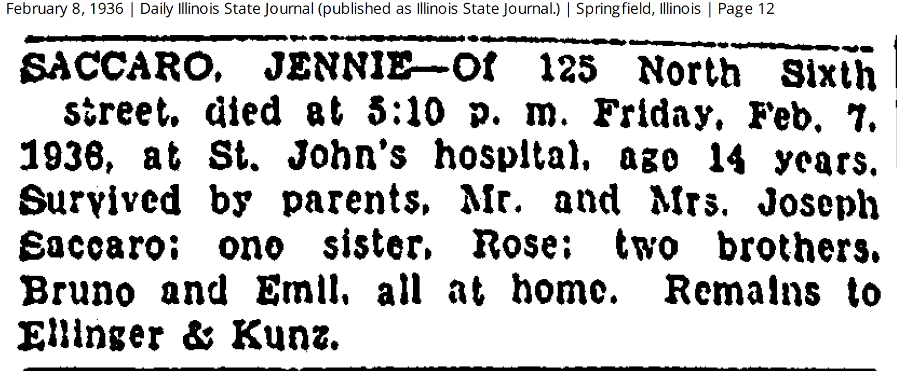 Giovanna "Jennie" Saccaro was born on January 21, 1921 in Nalles, South Tyrol, Trentino-Alto, Italy. She died on February 7, 1936, at age 15.