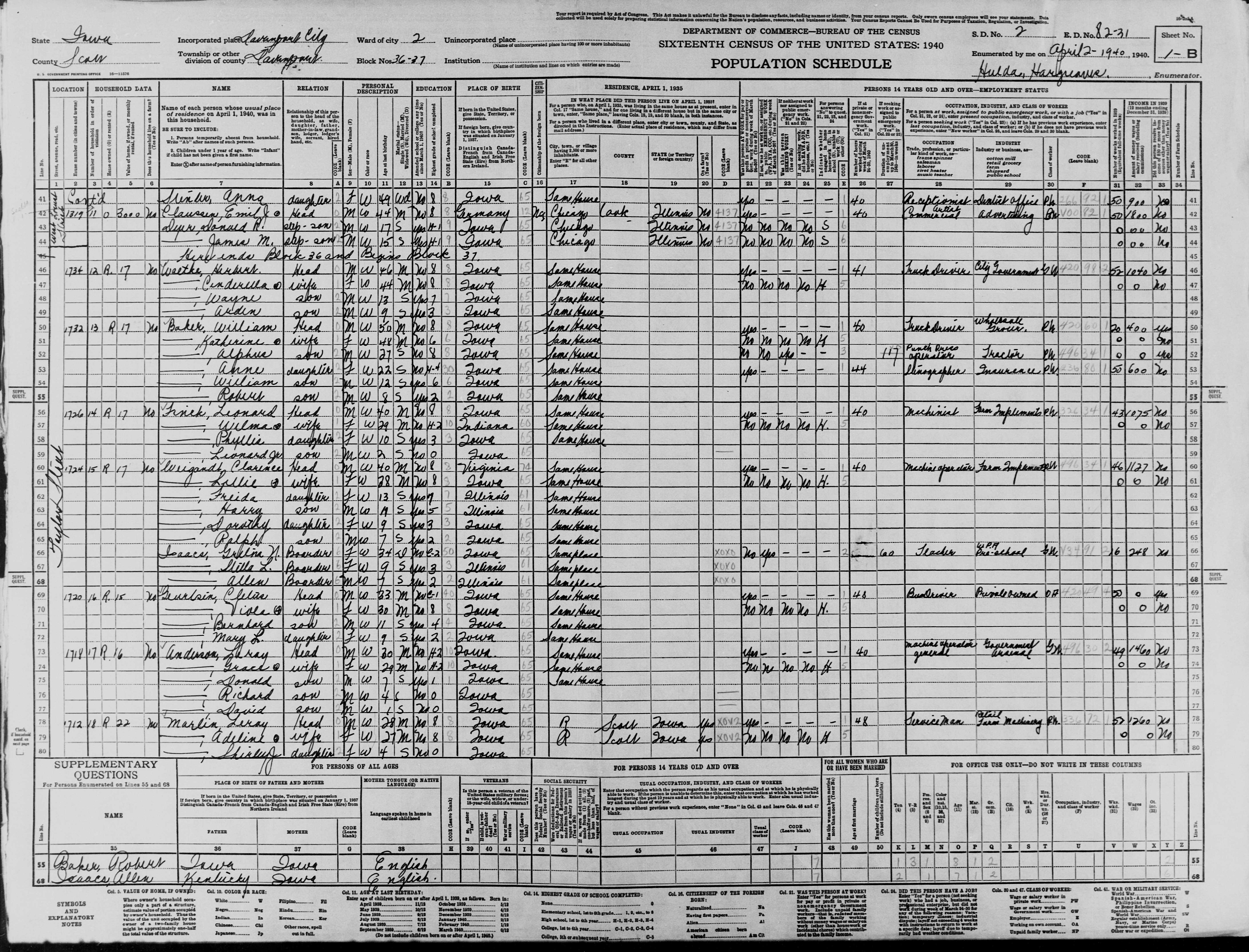 Hallauer Family 1940 Federal Census Iowa, Lines 57-59