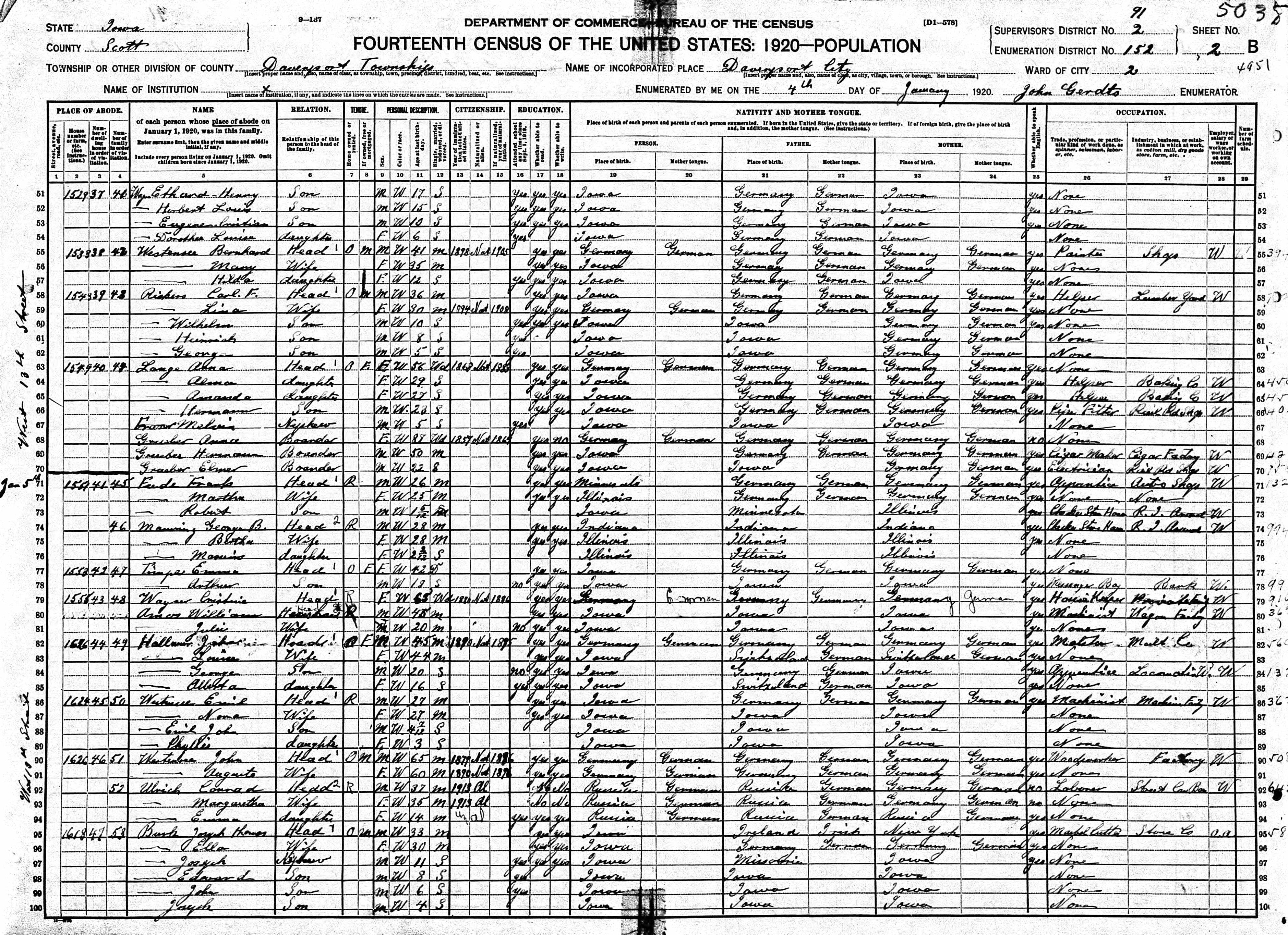 Hallauer Family 1920 Federal Census Iowa, Lines 82-85