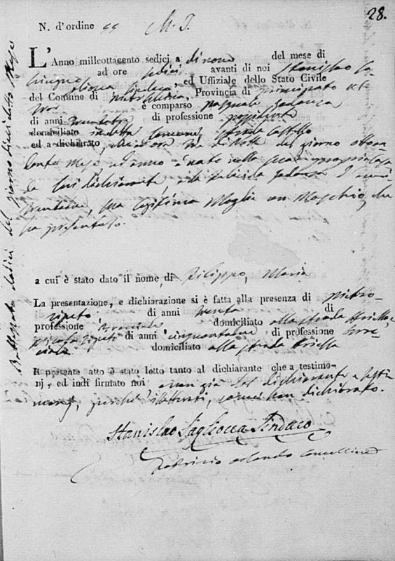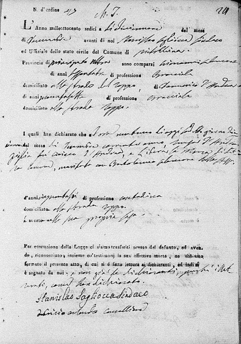 Orsola Paladino were married. He died on April 20, 1856, at age ~80, in Pietrelcina, Benevento, Campania, Italy.