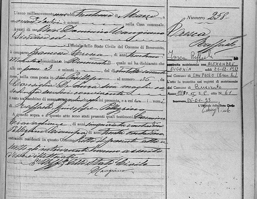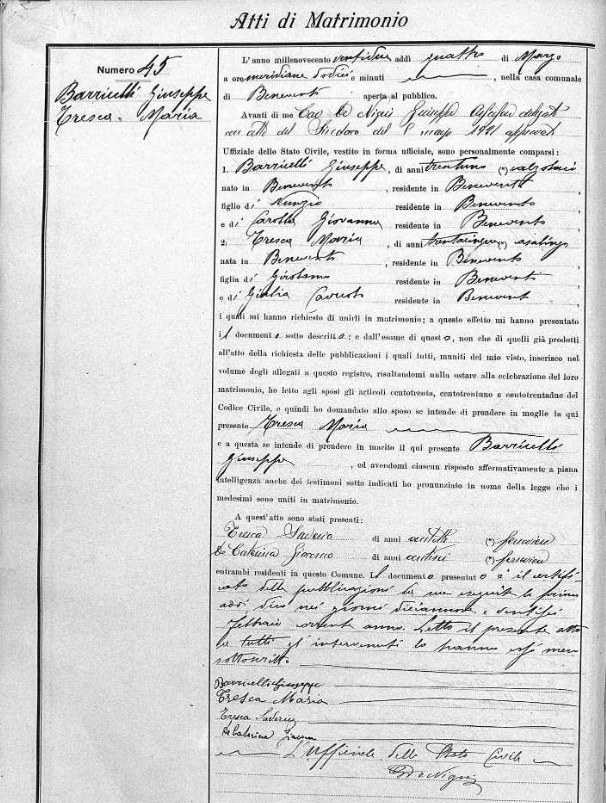 Natalina Tresca were married on October 2, 1922 in Benevento, Benevento, Campania, Italy. He died on March 24, 1959, at age ~58, in Benevento, Benevento, Campania, Italy.