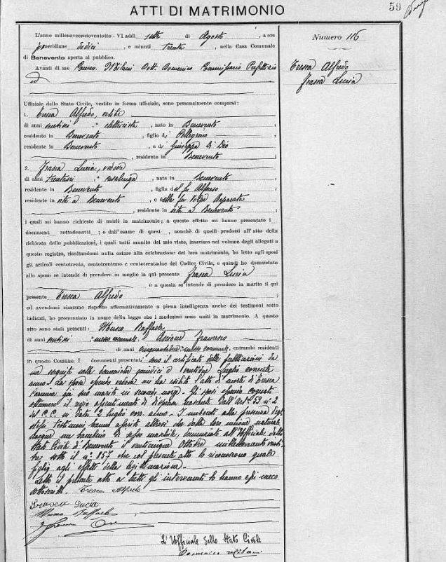 Lucia Maria Giovanna Frasca were married on July 22, 1915 in Benevento, Benevento, Campania, Italy. He died on December 27, 1918, at age 25, in Benevento, Benevento, Campania, Italy.