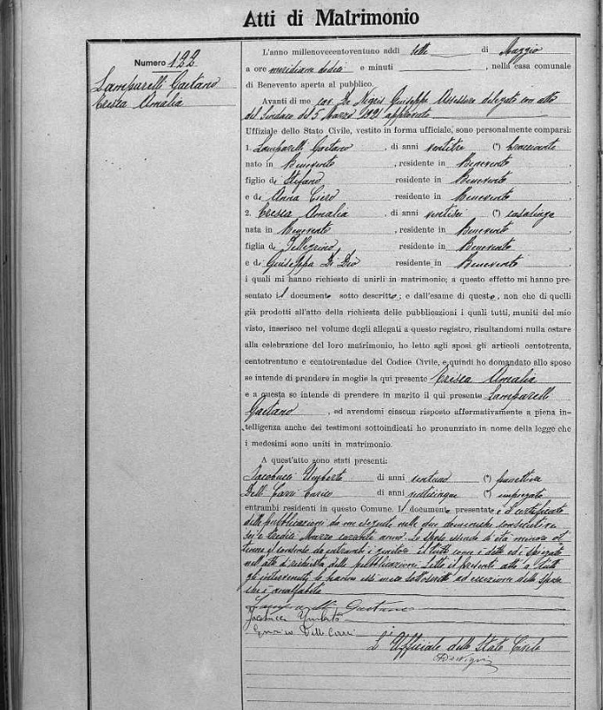 Amailia Tresca were married on May 7, 1921 in Benevento, Benevento, Campania, Italy. He died.