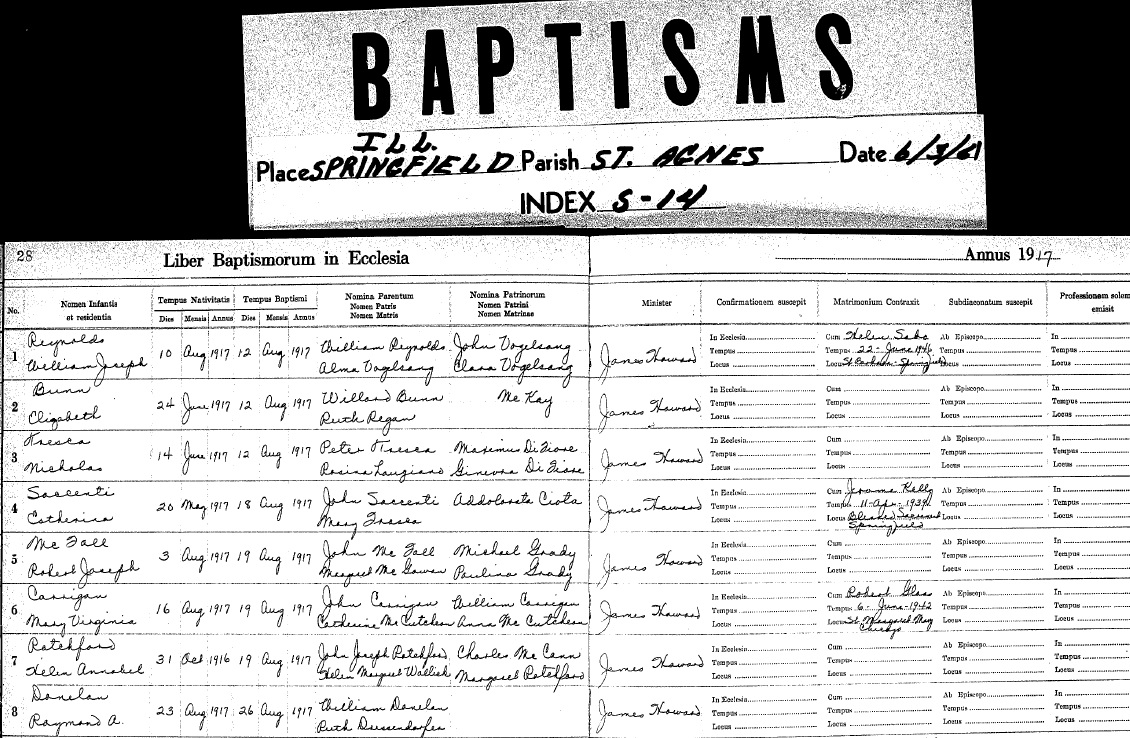 Nicholas Tresca was born on June 15, 1917 in Springfield, Sangamon, Illinois, USA. He died on August 24, 1917, at age 0, in Springfield, Sangamon, Illinois, USA. He was buried in Calvary Cemetery, Springfield, Illinois.