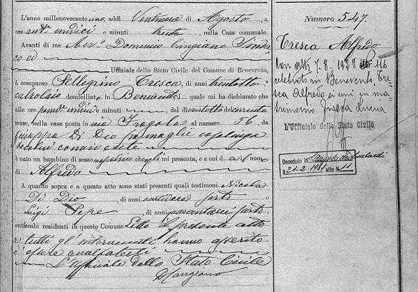 Alfredo Tresca were married on August 7, 1921 in Benevento, Benevento, Campania, Italy. She died.