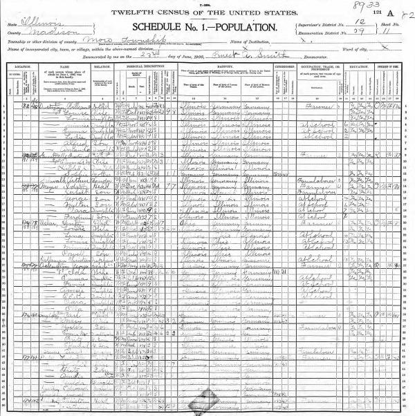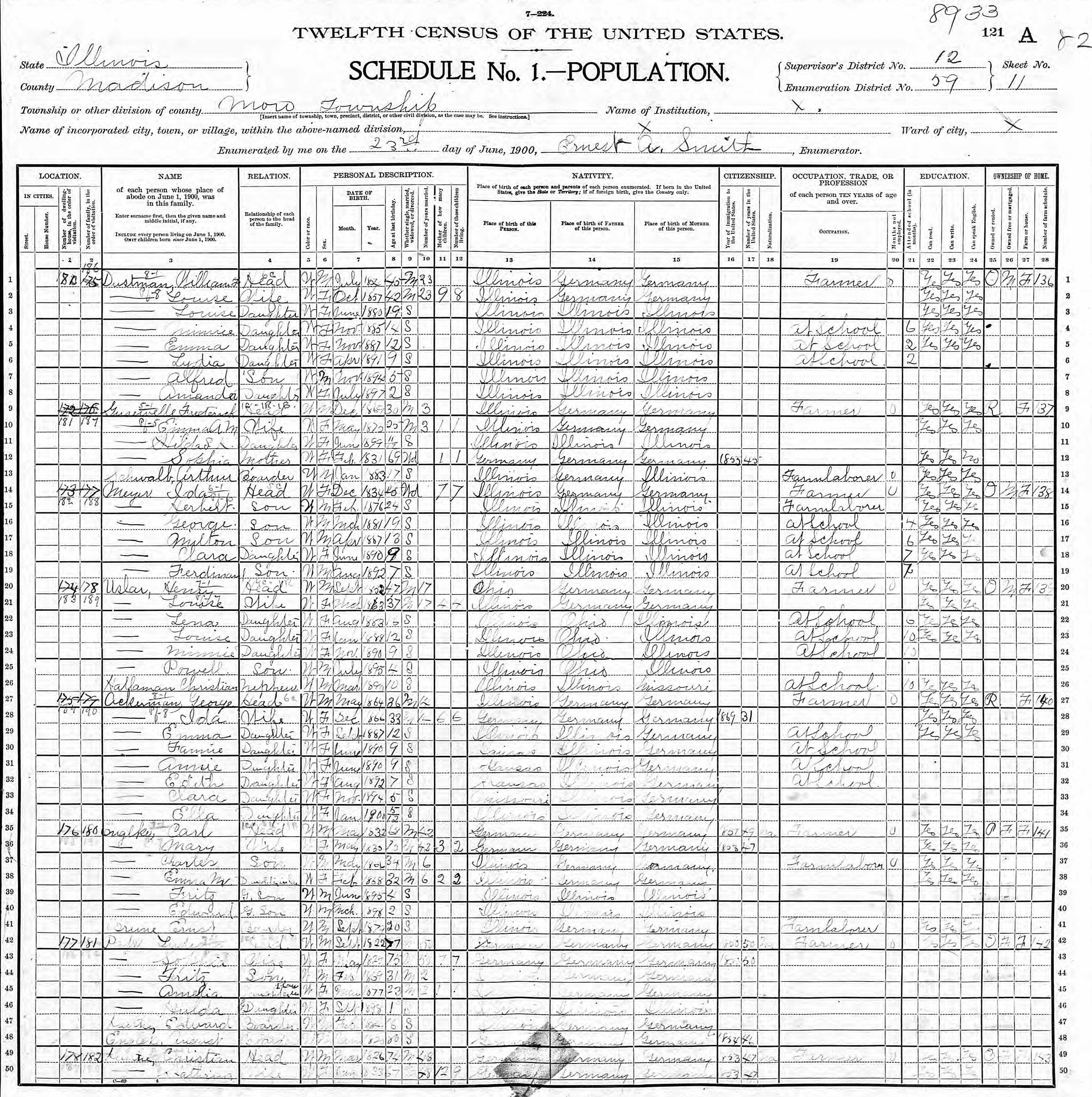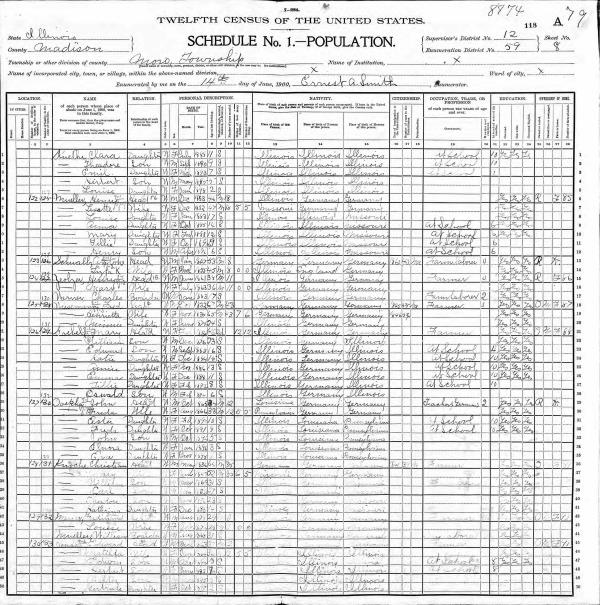 Dustmann Family 1900 Federal Census Illinois, Lines 1-8
