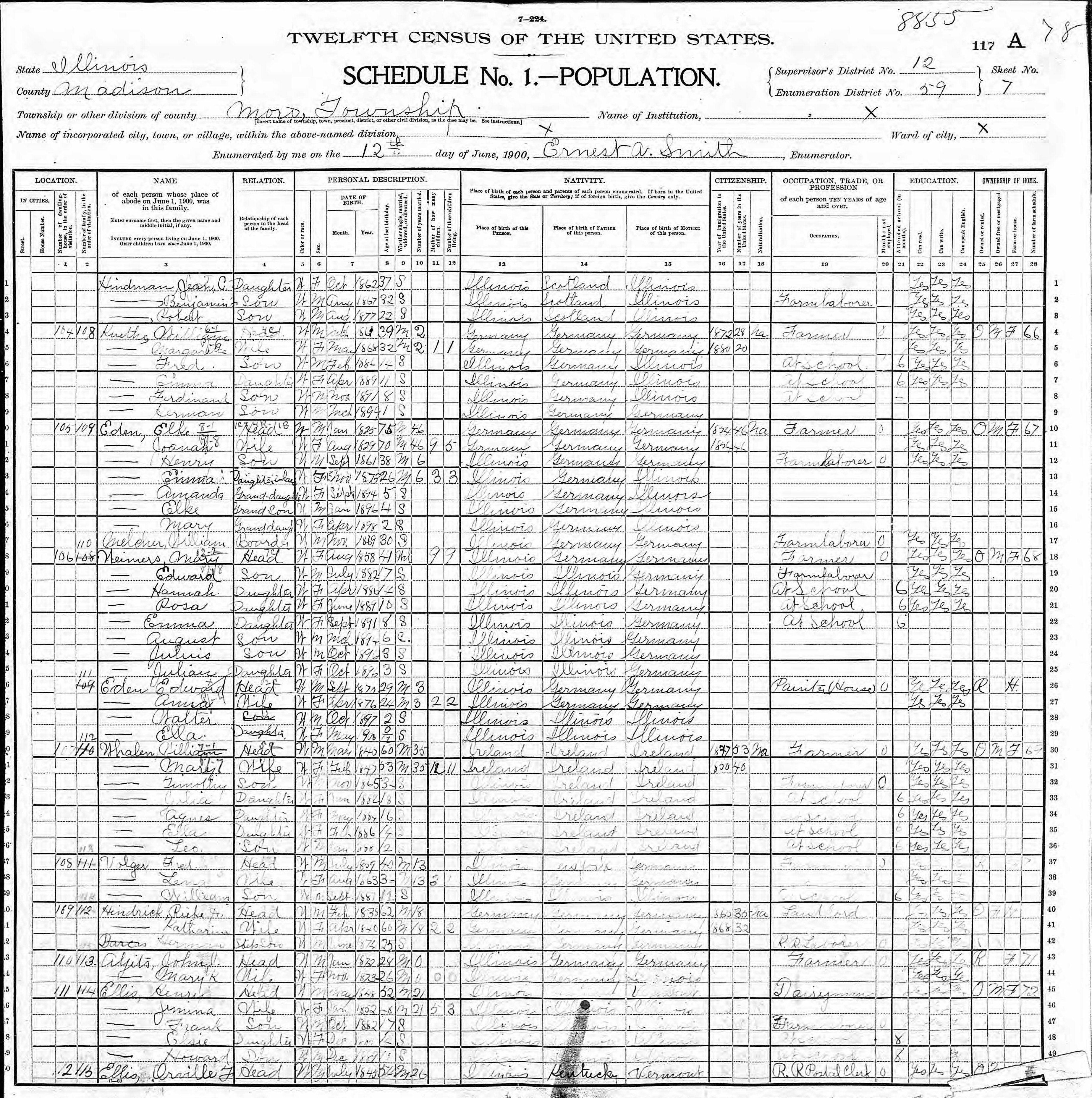 Eden Family 1900 Federal Census Illinois, Lines 10-16