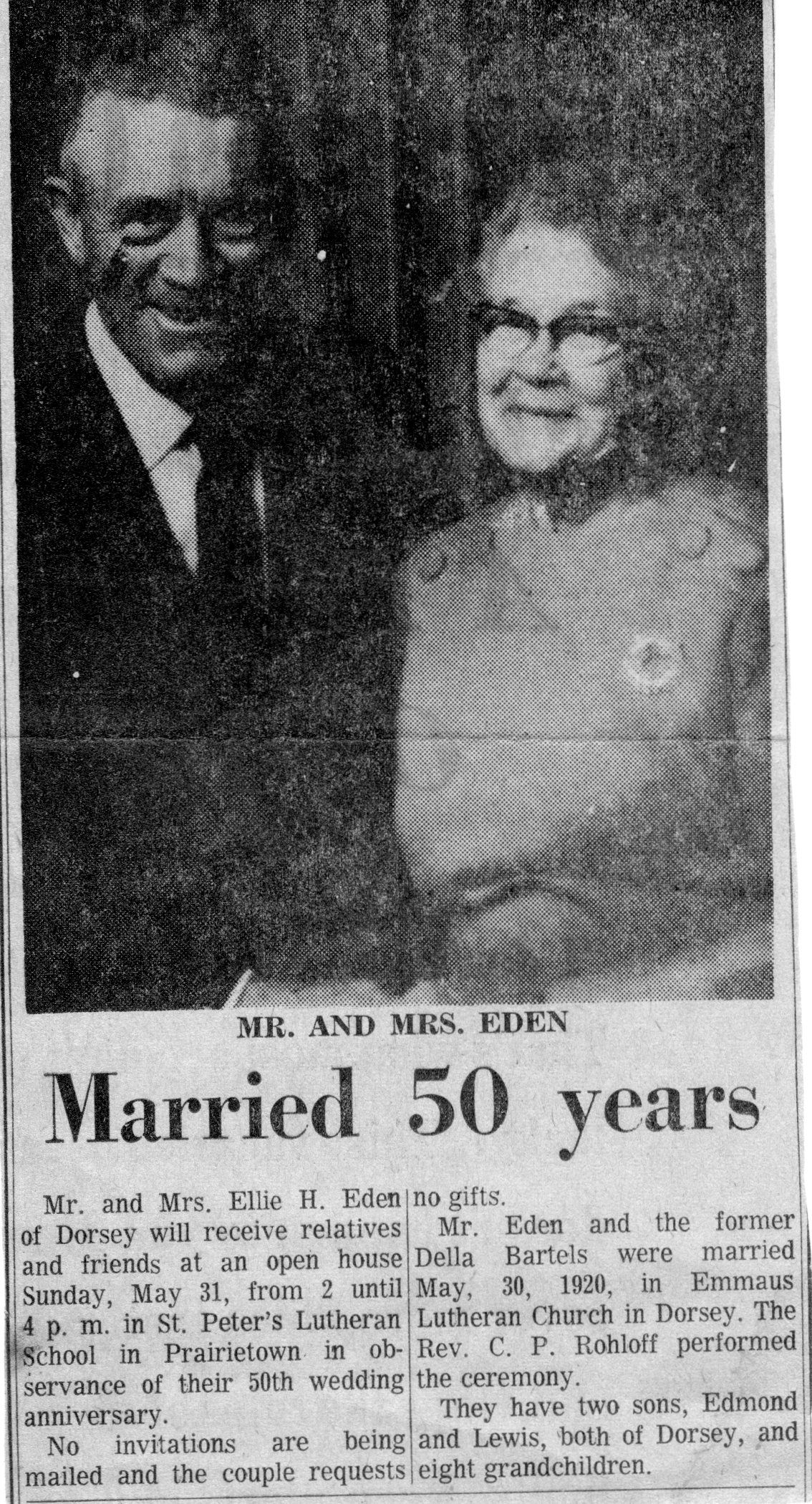 Edena were married. He died in 1976, at age ~83. He was buried in Prairietown Cemetery, Prairietown, Illinois.