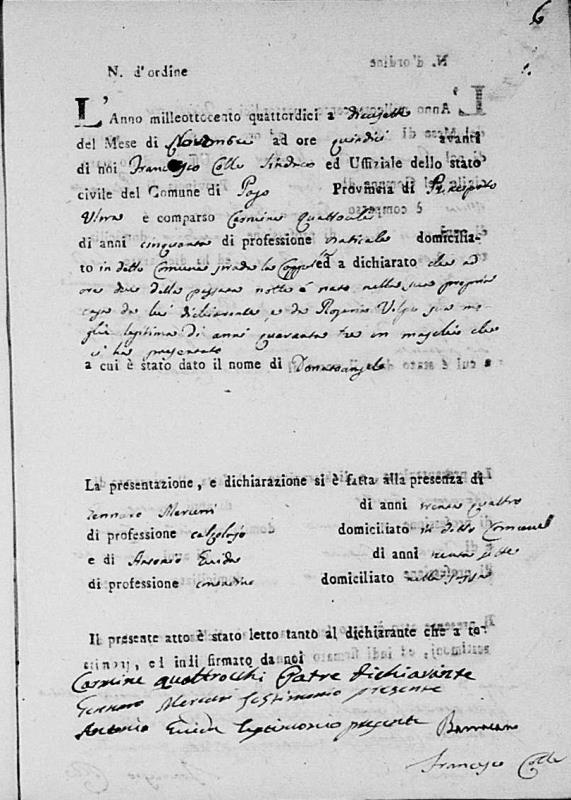 Domenica Quattrocchi were married on February 21, 1822 in Pago Veiano, Benevento, Campania, Italy. He died.