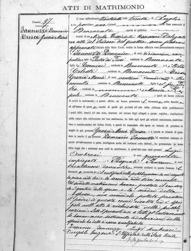 Domenico Iannuzzi were married on July 30, 1887 in Benevento, Benevento, Campania, Italy. She died.