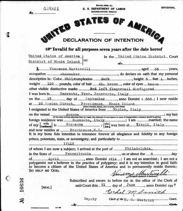 Vincenzo Martinelli were married on December 20, 1913 in Benevento, Benevento, Campania, Italy. She died in November 1988, at age 97, in Cranston, Providence, Rhode Island, USA. She was buried in Saint Ann Cemetery, Cranston, Rhode Island.
