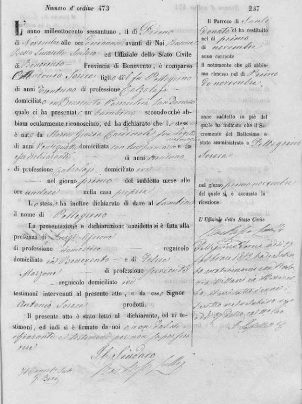 Pellegrino Soreca was born on November 1, 1861 in Pietrelcina, Benevento, Campania, Italy. He and