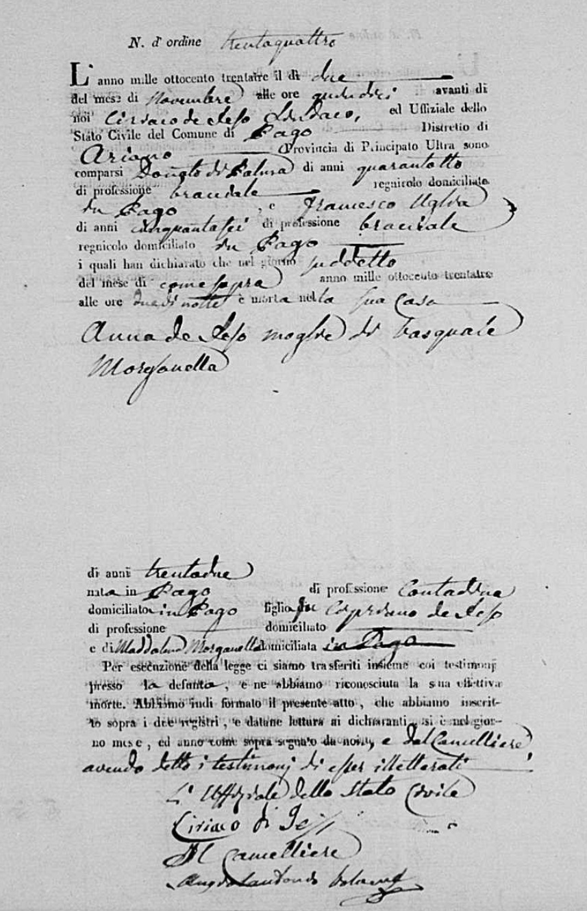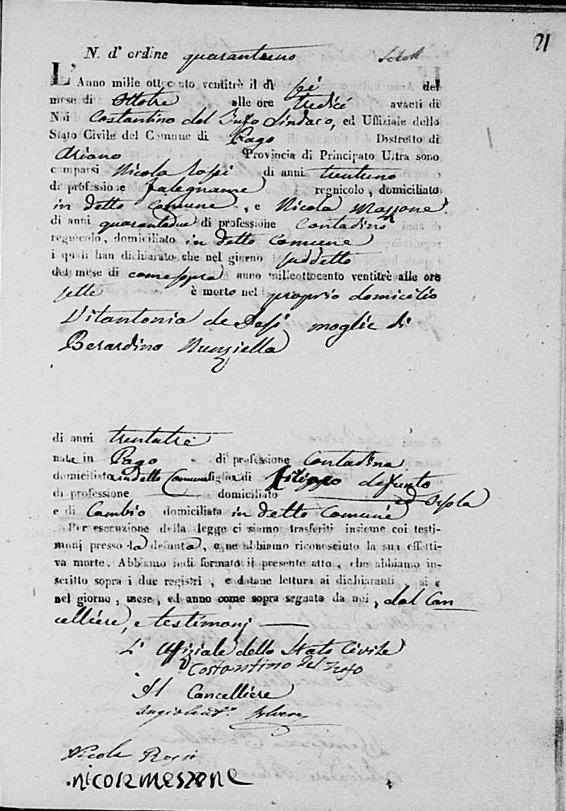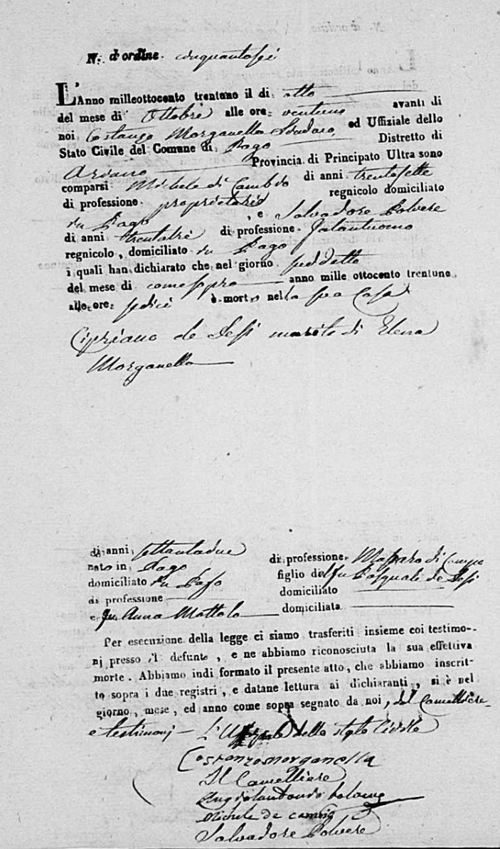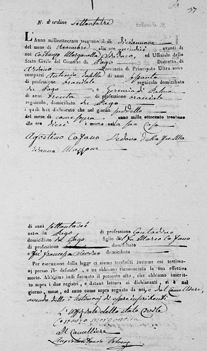 Maddalena Morganella were married. He died on October 8, 1831, at age ~72, in Pago Veiano, Benevento, Campania, Italy.