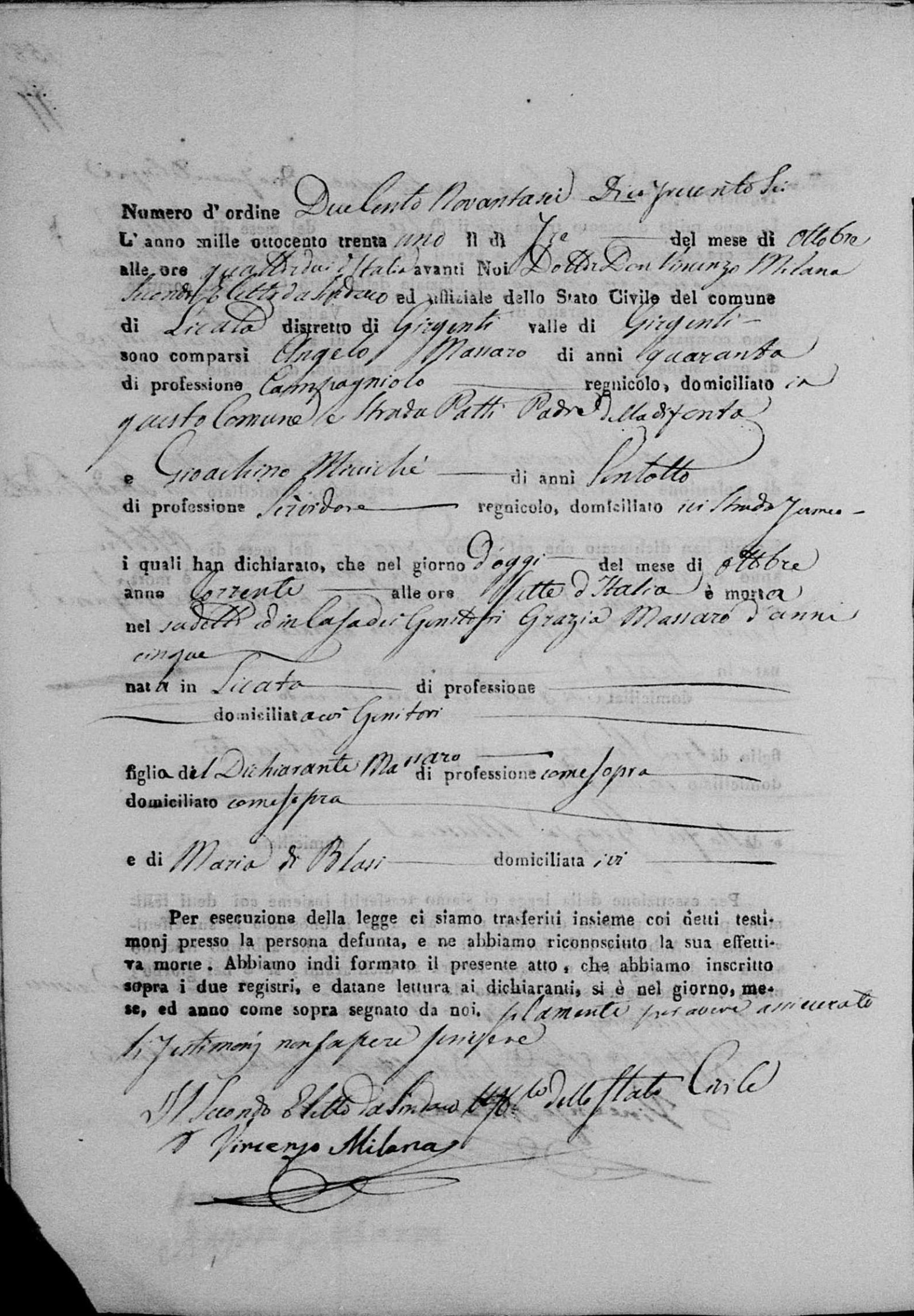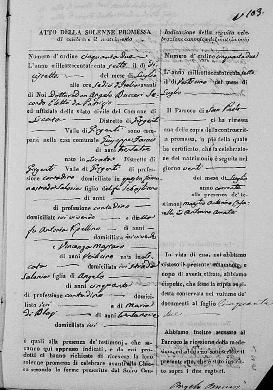 Vincenza Massaro were married on July 20, 1837 in Licata, Agrigento, Sicily, Italy. He died.