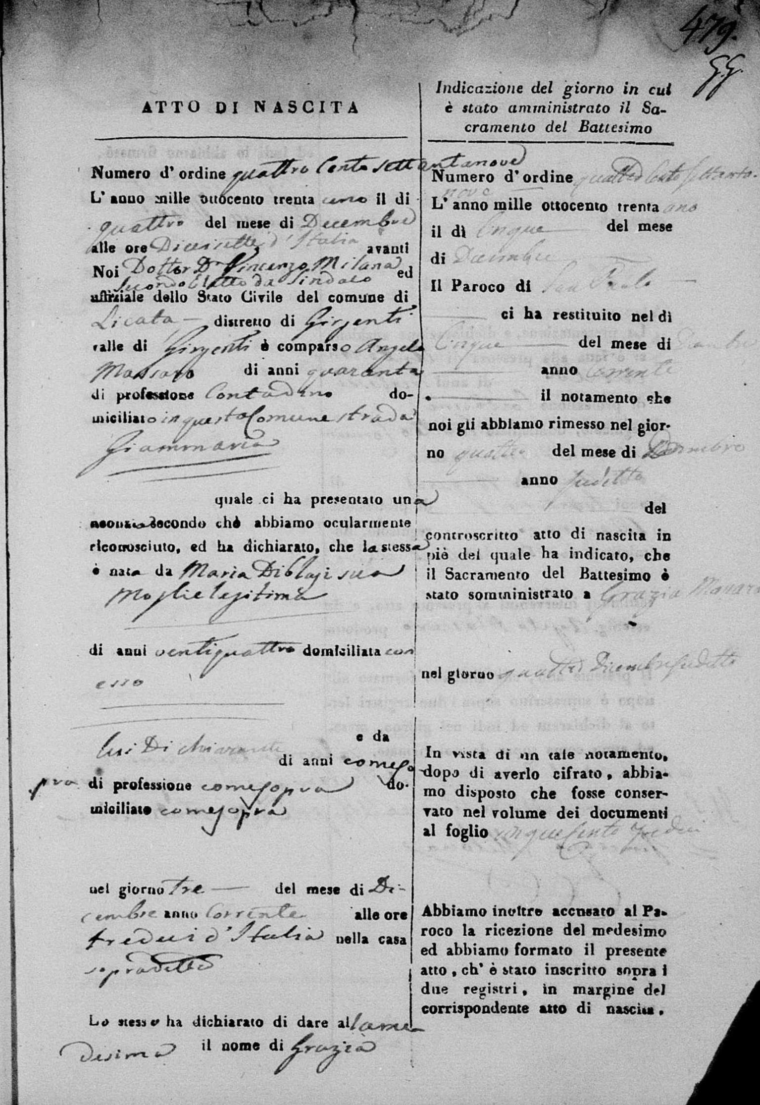 Vincenzo Massaro was born on March 2, 1820 in Licata, Agrigento, Sicily, Italy. He and