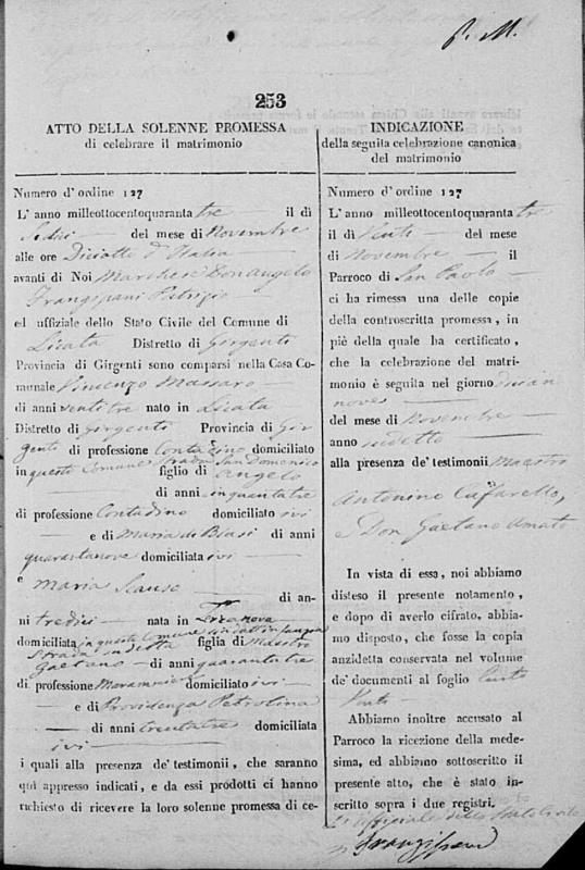 Vincenzo Massaro were married on November 19, 1843 in Licata, Agrigento, Sicily, Italy. She died.