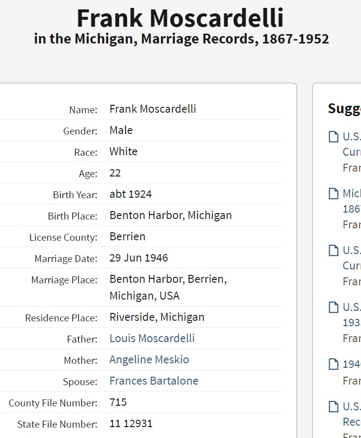 Frank Louis Moscardelli were married on June 29, 1946 in Benton Harbor, Berrien, Michigan, USA. She died on January 1, 1967, at age ~40, in Grand Rapids, Kent, Michigan, USA. She was buried in North Shore Memory Gardens, Coloma, Michigan.
