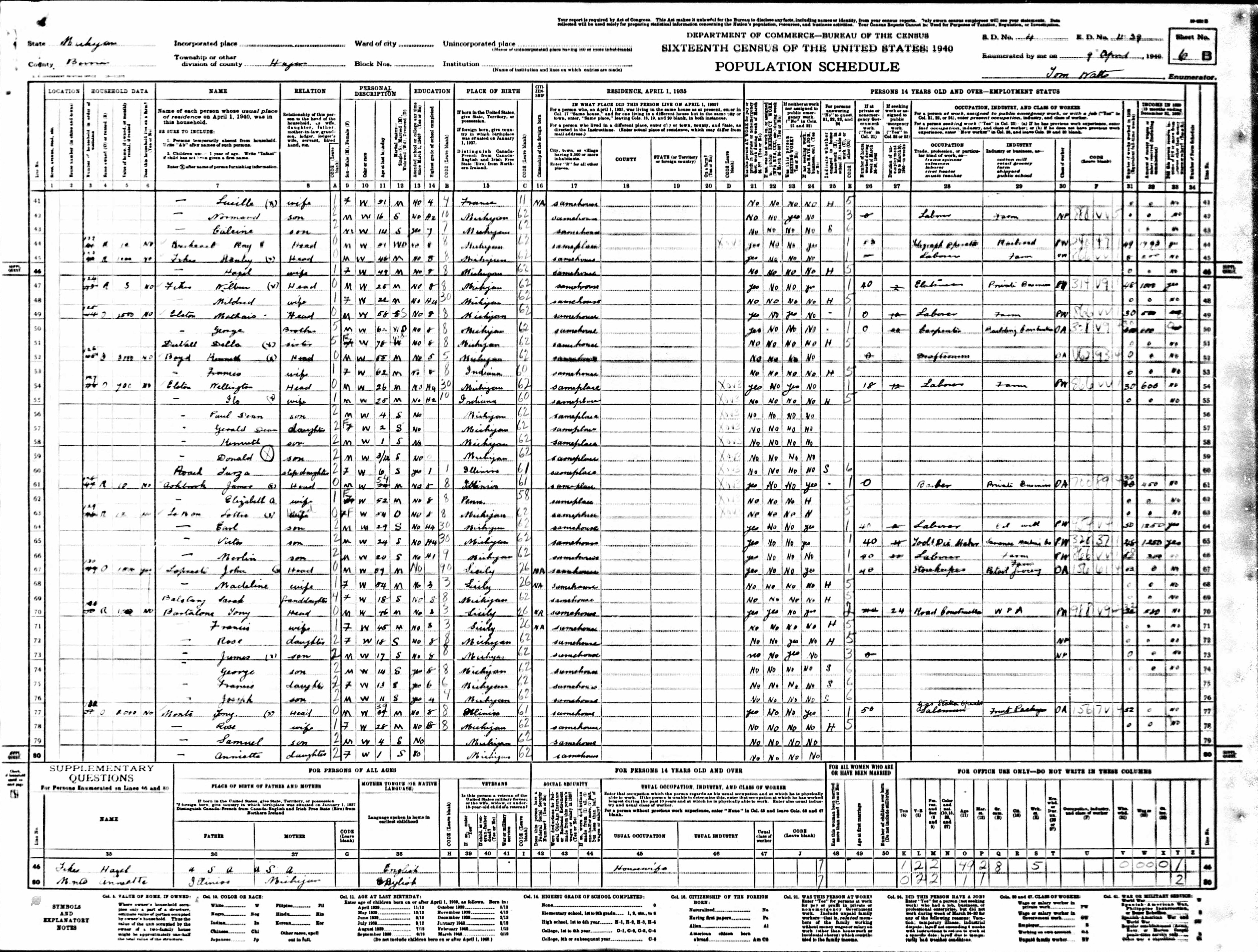 Bartalone Family 1940 Federal Census Michigan, Lines 70-76