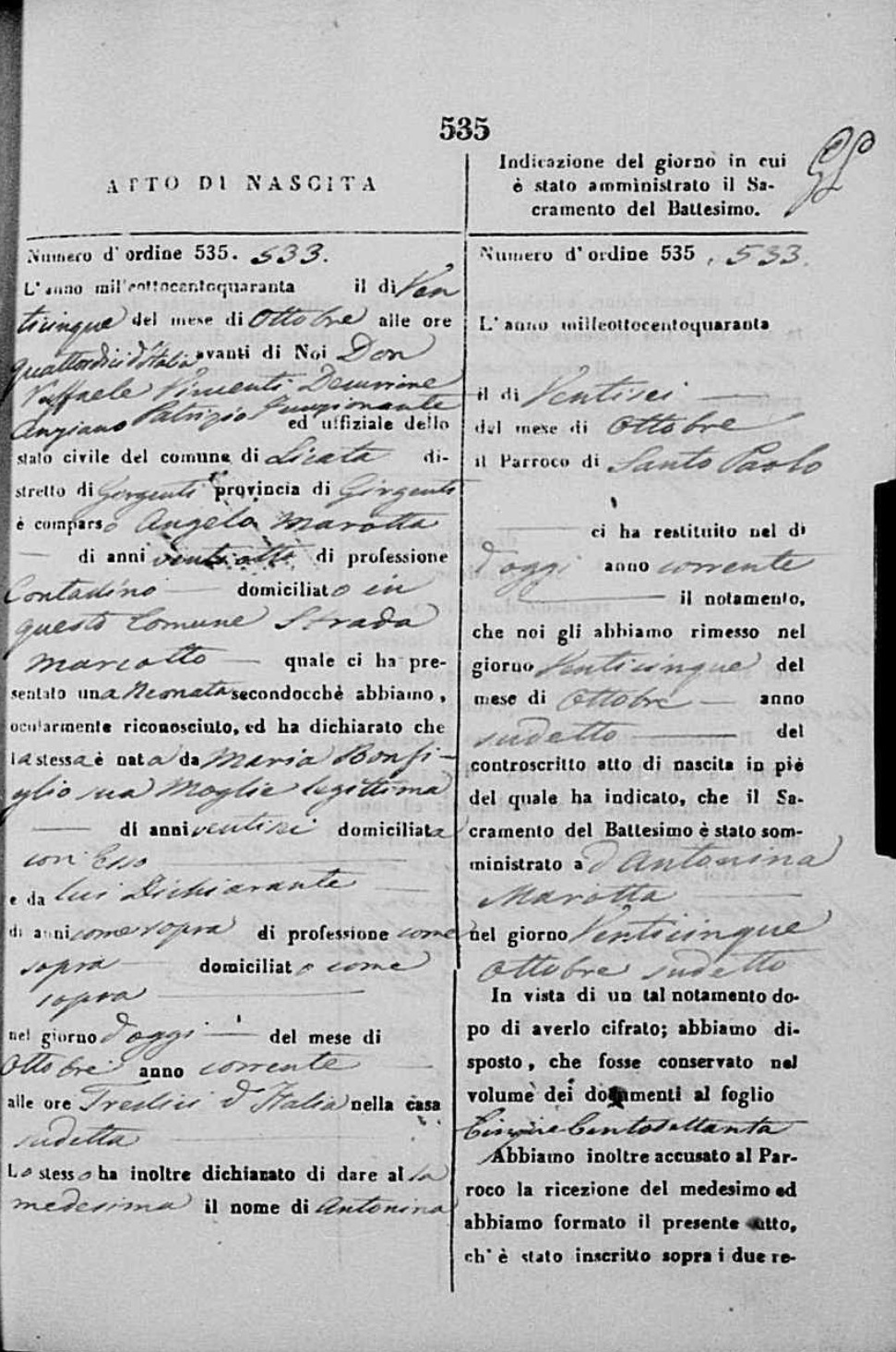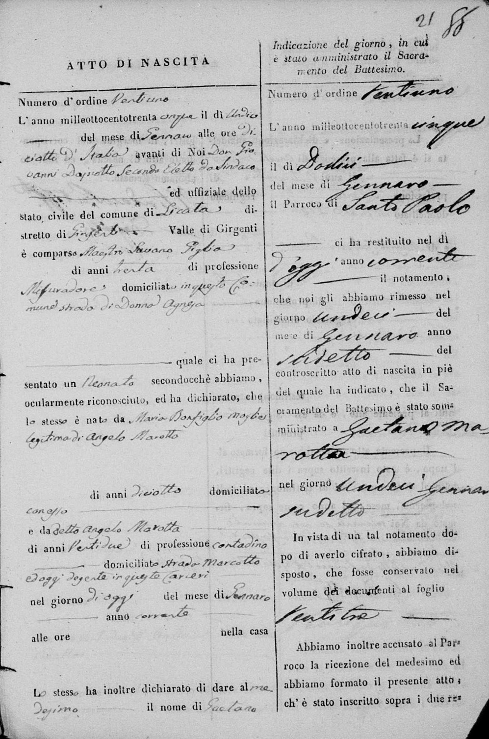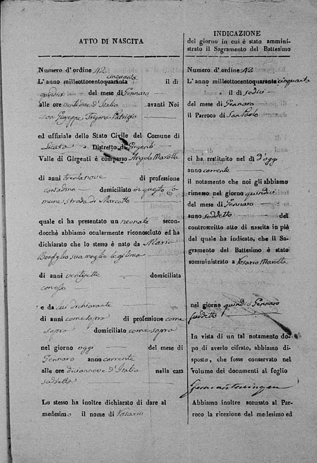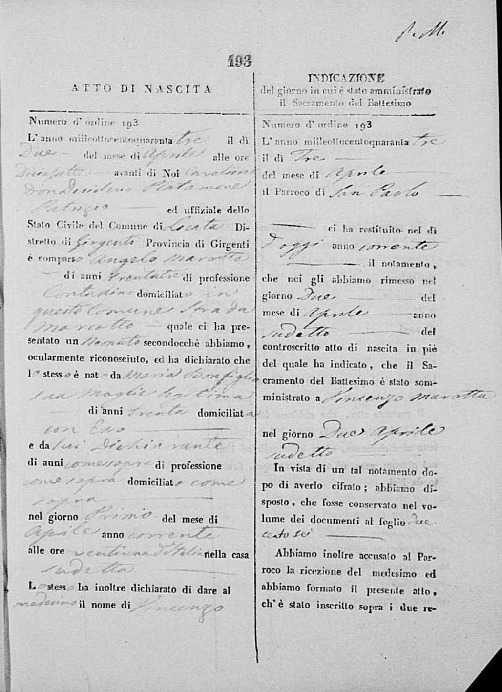 Angelo Marotta was born in 1811 in Licata, Agrigento, Sicily, Italy. He and