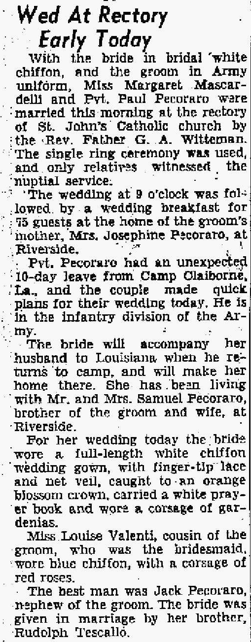 Paul Pecoraro were married on June 9, 1943 in Benton Harbor, Berrien, Michigan, USA. She and