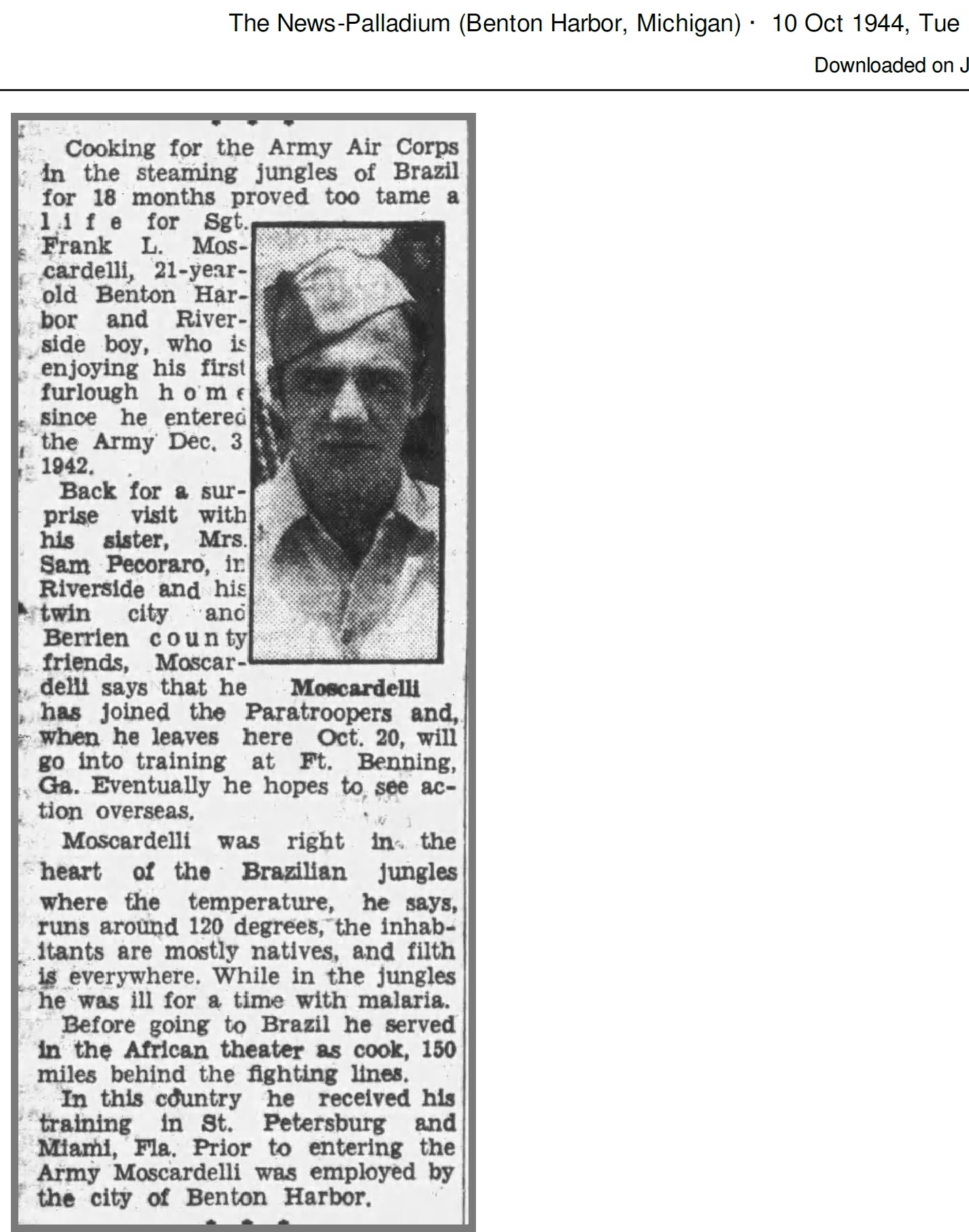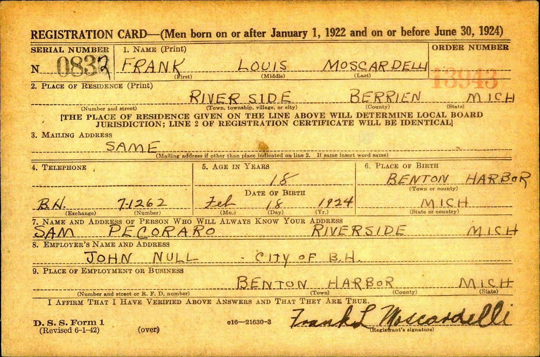 Frank Louis Moscardelli was born on February 18, 1924 in Benton Harbor, Berrien, Michigan, USA. He and
