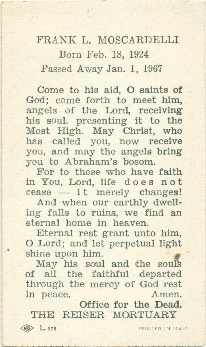 Frank Moscardelli Prayer Card Back