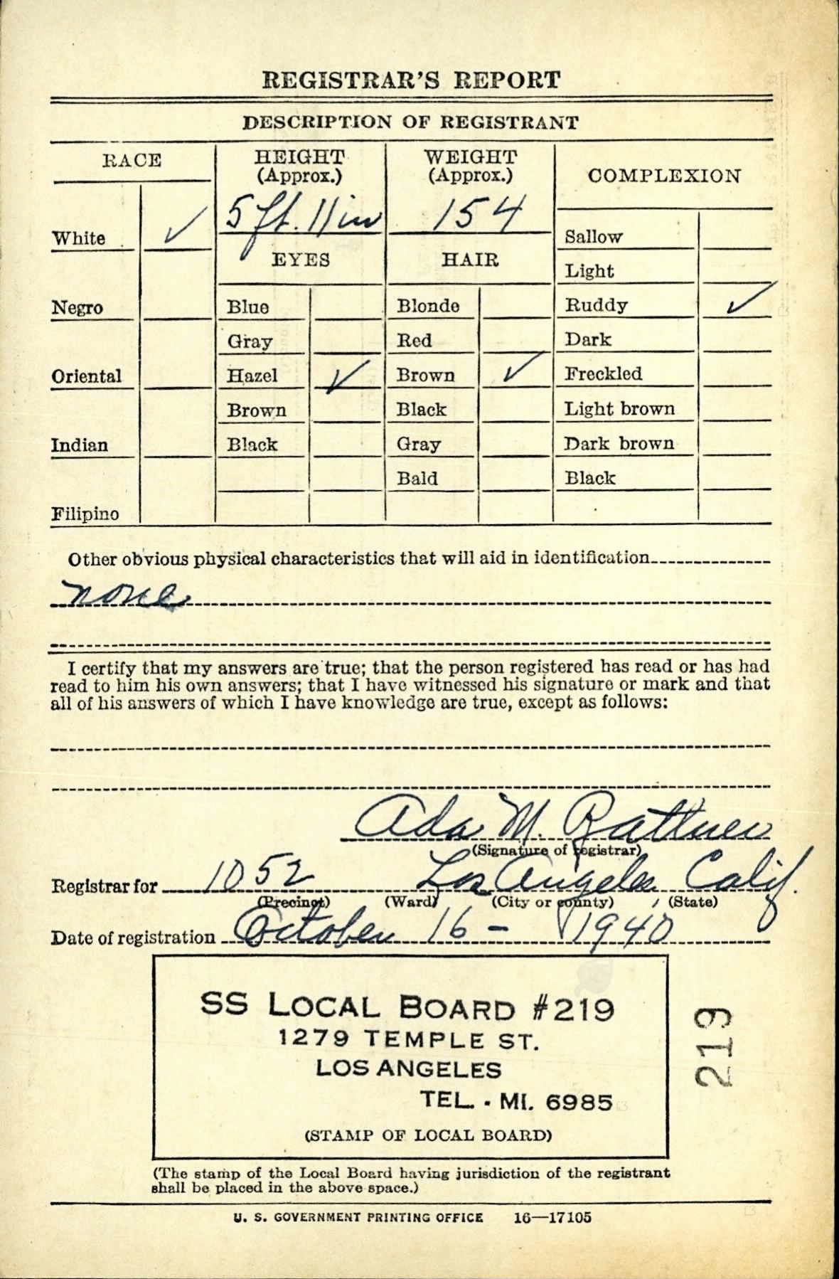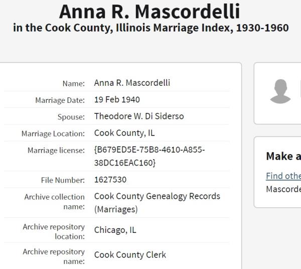 Anna Rose Moscardelli were married on February 19, 1940 in Cook, Illinois, USA. He died on March 16, 1944, at age 29, in British Isles. He was buried in Golden Gate National Cemetery, San Burno, California.