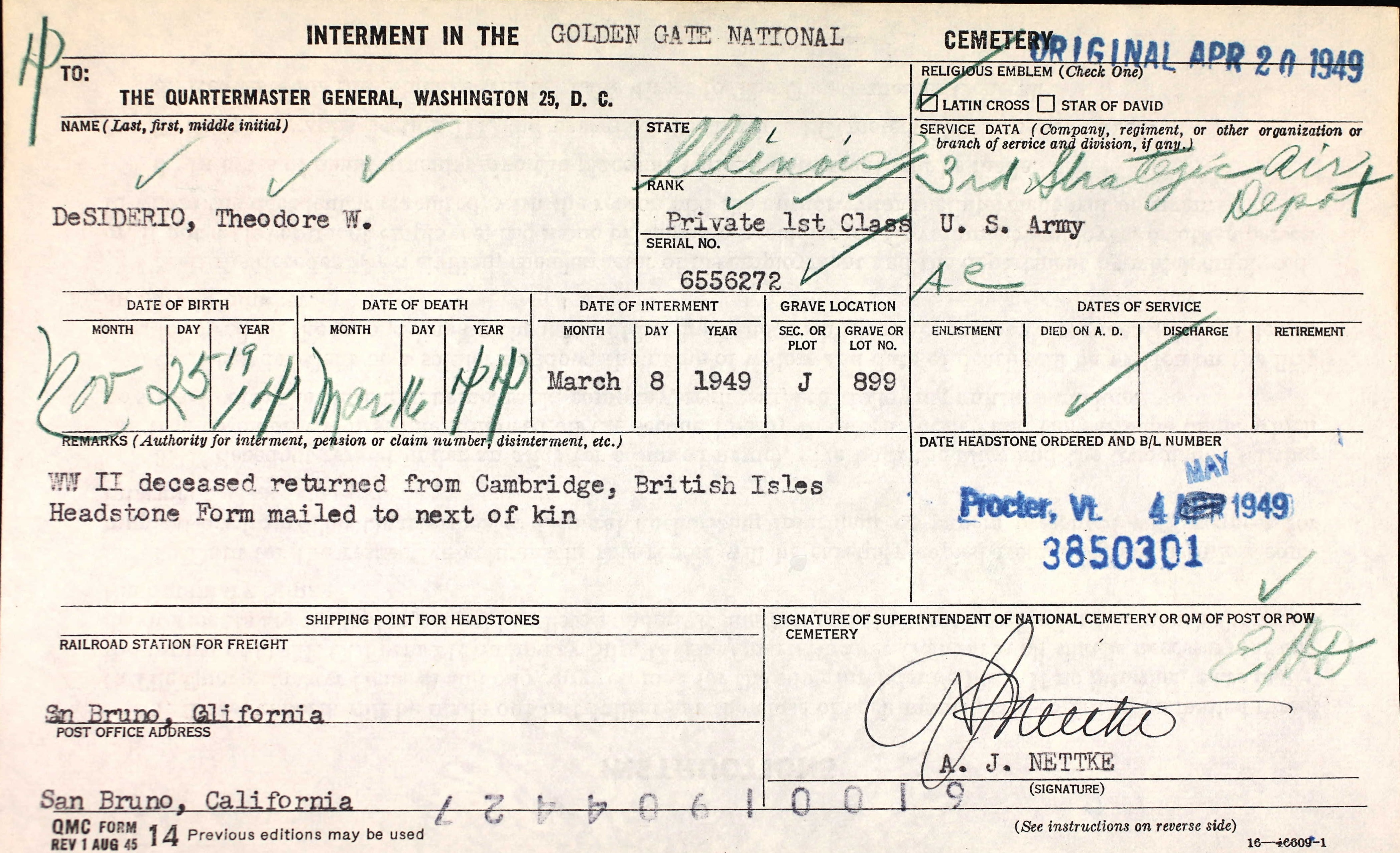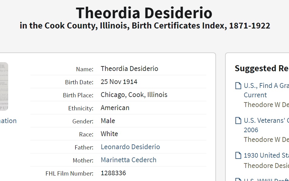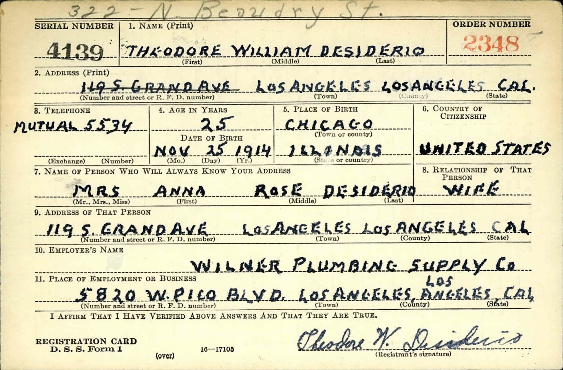 Theodore William Desiderio was born on November 25, 1914 in Chicago, Cook, Illinois, USA. He and