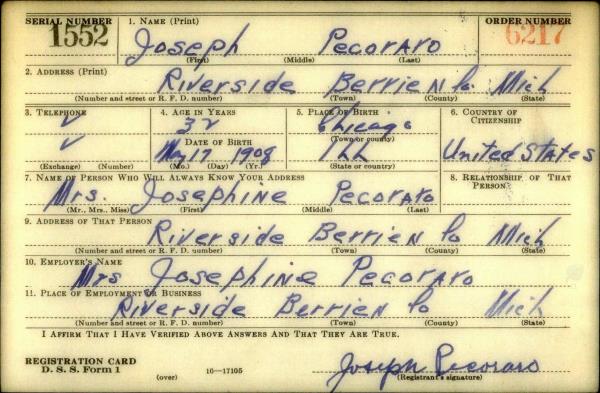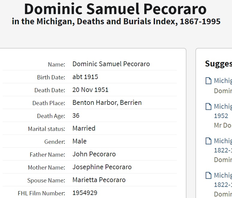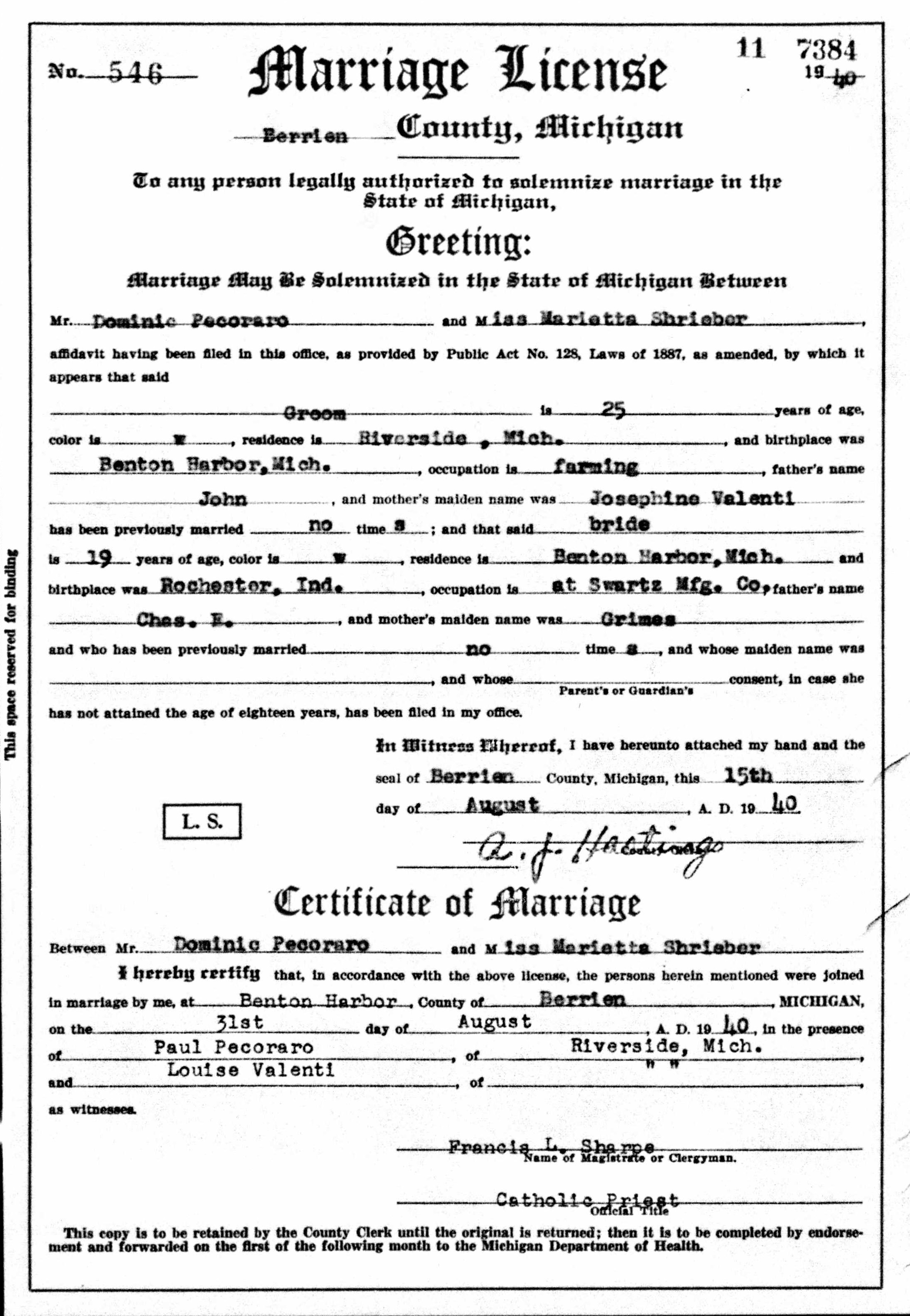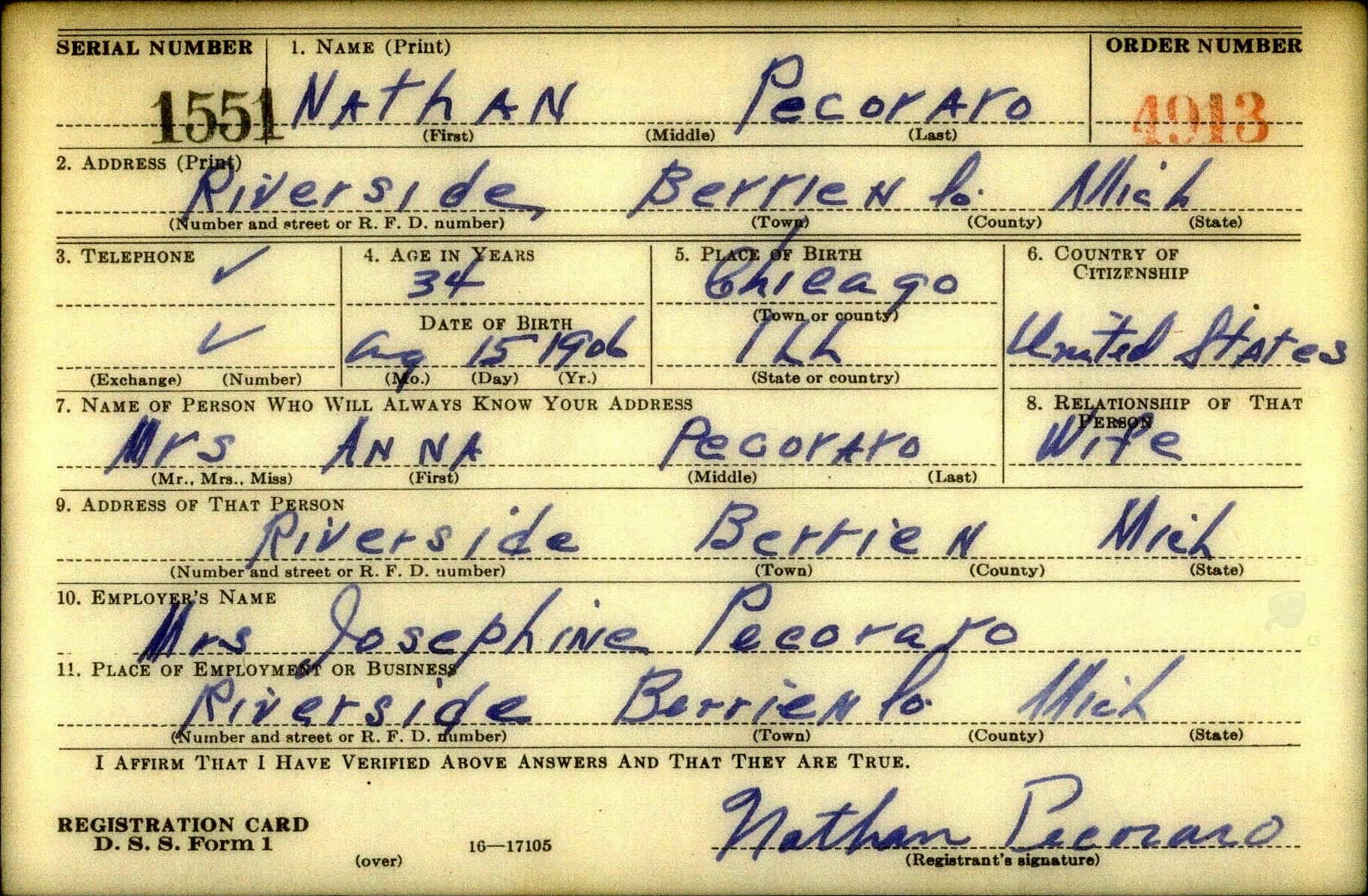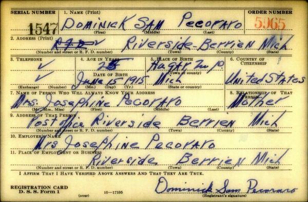 Dominick Samuel Pecoraro was born on June 15, 1915 in Benton Harbor, Berrien, Michigan, USA. He and